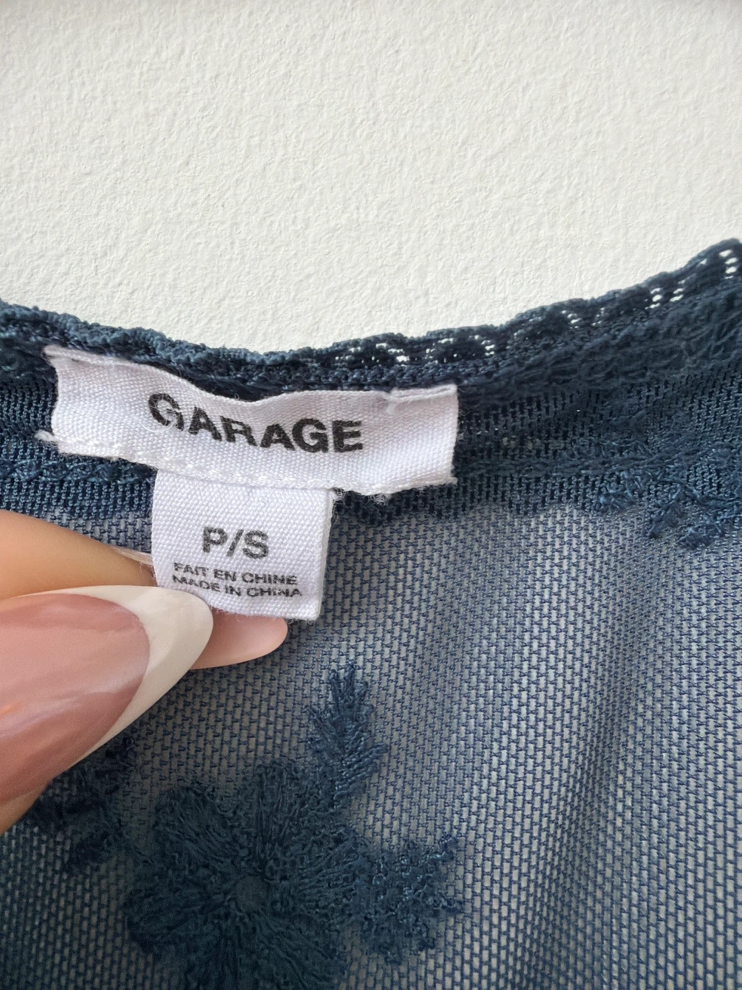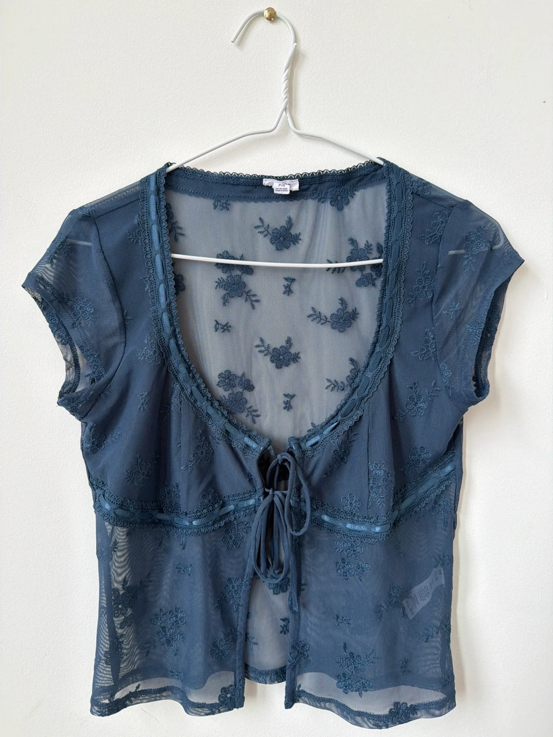 Blue sheer mesh top with floral embroidery. Short sleeves and a tie front closure. Made from 95% polyester and 5% spandex. has never been worn just doesn’t have the tag