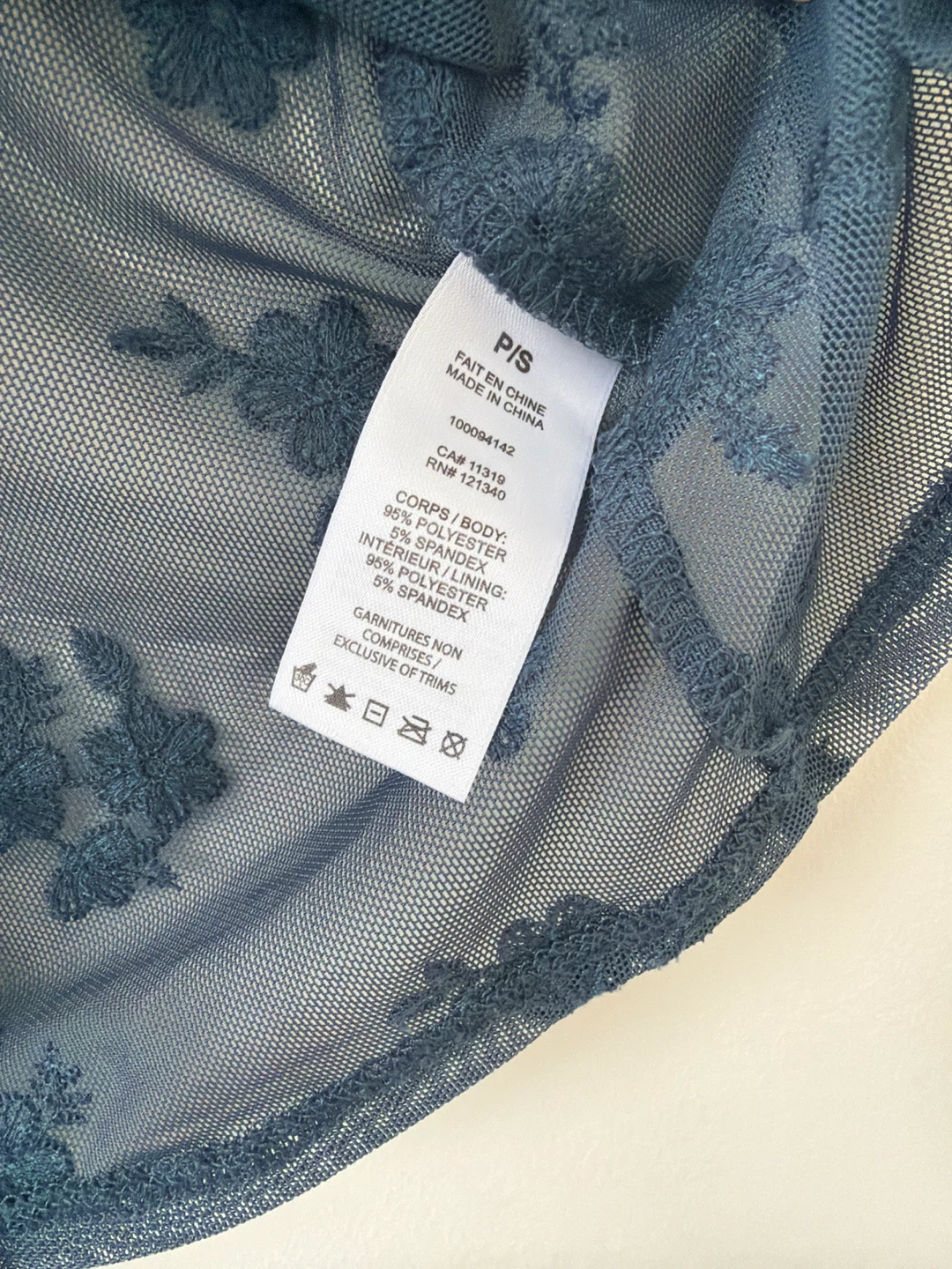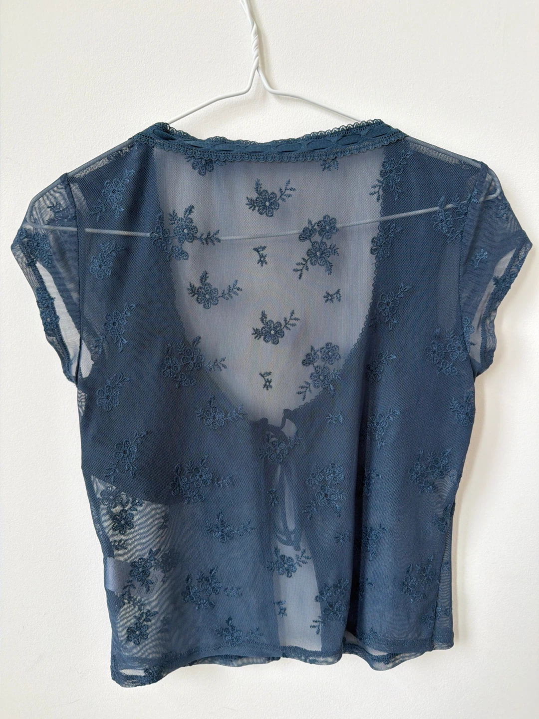 Blue sheer mesh top with floral embroidery. Short sleeves and a tie front closure. Made from 95% polyester and 5% spandex. has never been worn just doesn’t have the tag