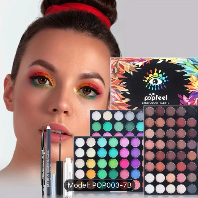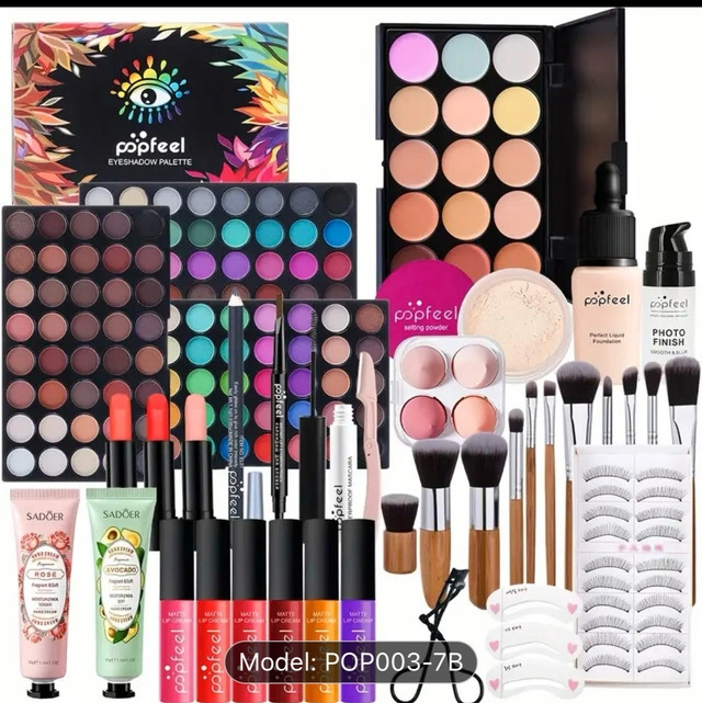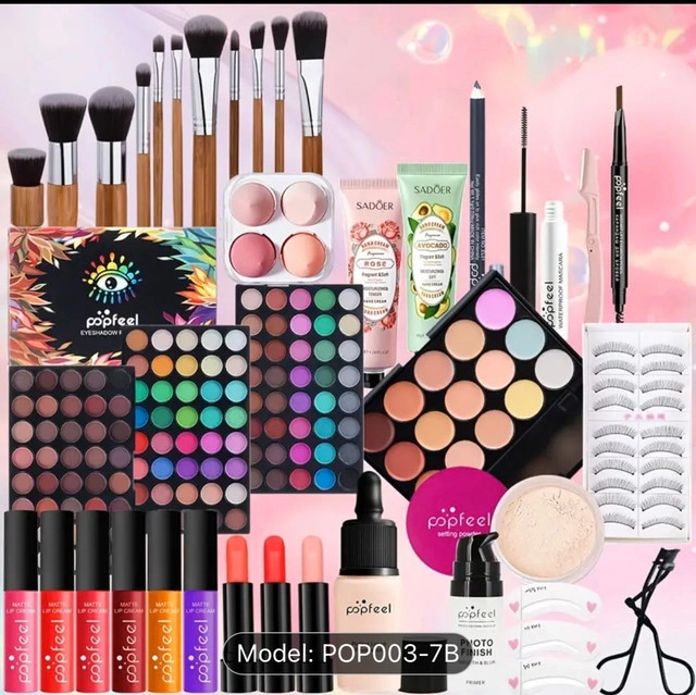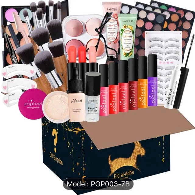 Large makeup kit. Includes eyeshadow palettes, lipsticks, brushes, eyeliner, mascara, and more. Perfect for gifting or personal use. Brand new. Model POP003-7B. POPFEEL Eid Al-Adha Gift Box, Mixed Color System Makeup Set with Eyeshadow Palette, Lipstick, Eyelash Extensions, Eyebrow Pencil, and More.