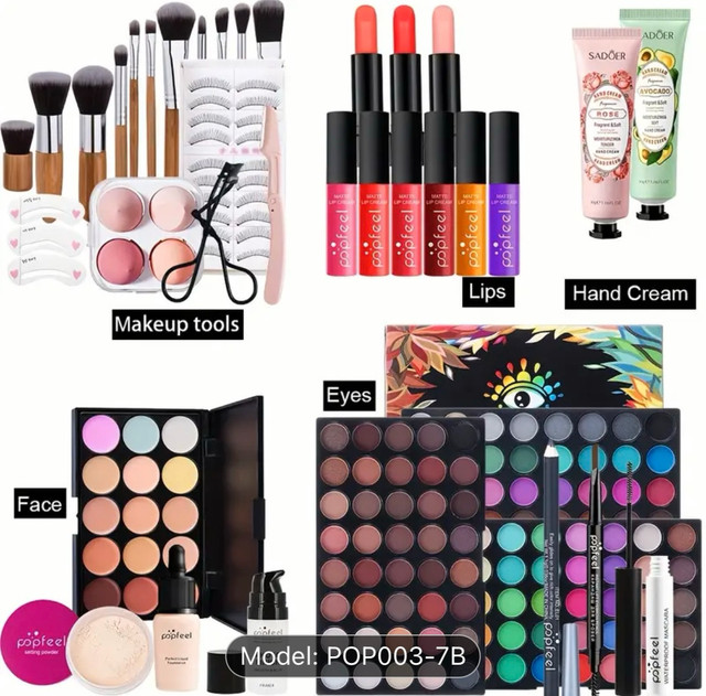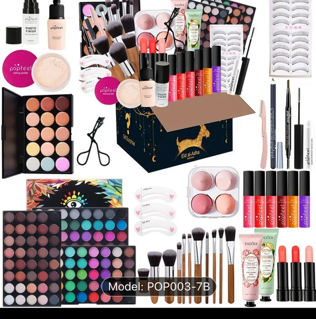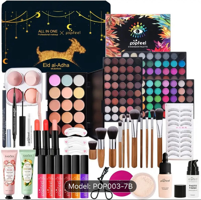 Large makeup kit. Includes eyeshadow palettes, lipsticks, brushes, eyeliner, mascara, and more. Perfect for gifting or personal use. Brand new. Model POP003-7B. POPFEEL Eid Al-Adha Gift Box, Mixed Color System Makeup Set with Eyeshadow Palette, Lipstick, Eyelash Extensions, Eyebrow Pencil, and More.