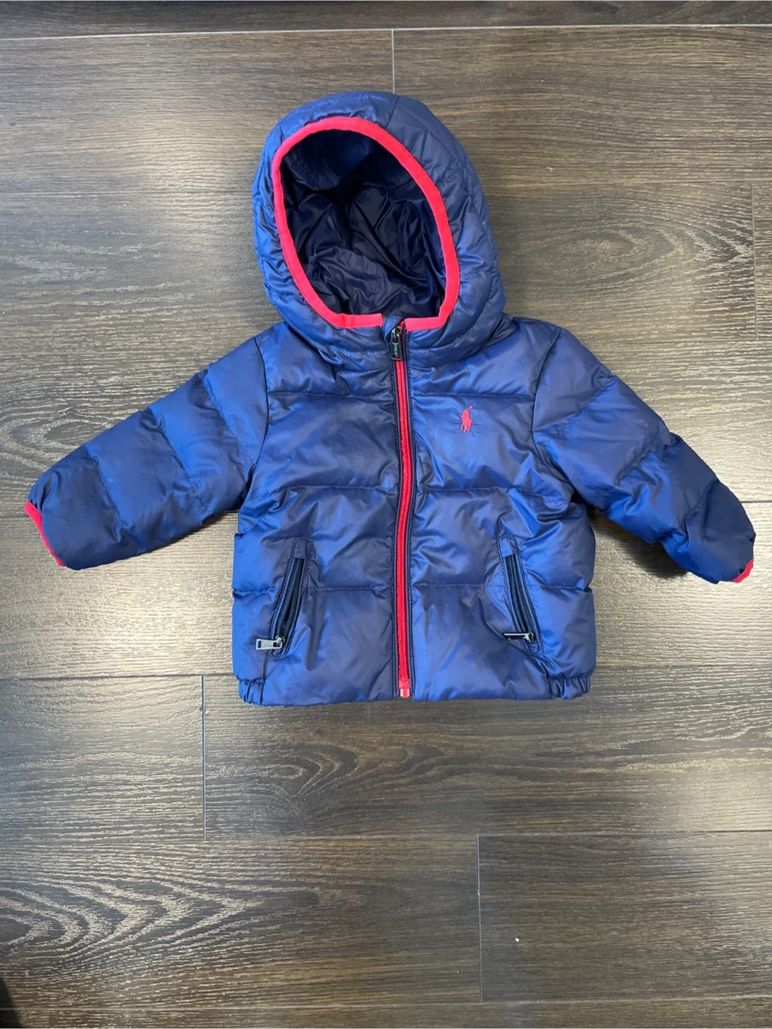 Navy blue puffer jacket by Ralph Lauren. Bought new, only worn a few times before baby outgrew it. Size 9mo, fits generously.