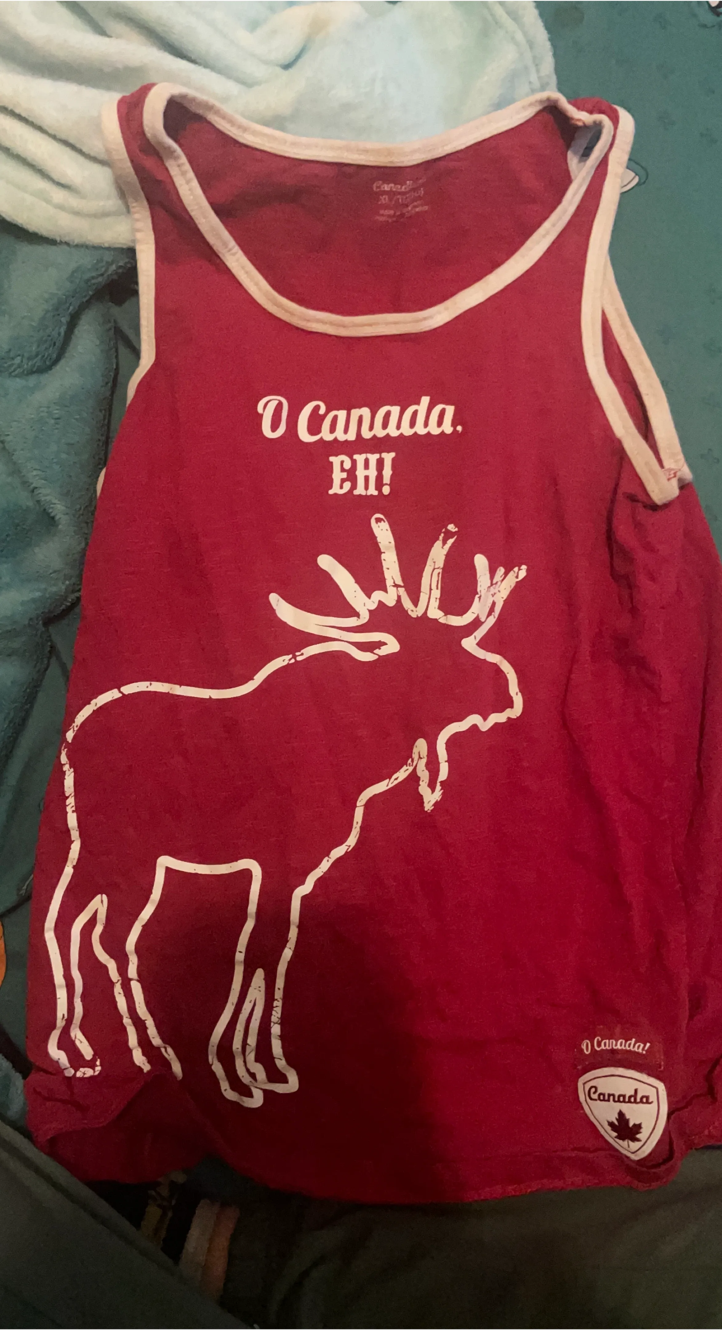 Red tank top featuring a white moose graphic and "O Canada EH!" text. Includes a small "O Canada! Canada" crest on the hem. This top is great for showing Canadian pride!