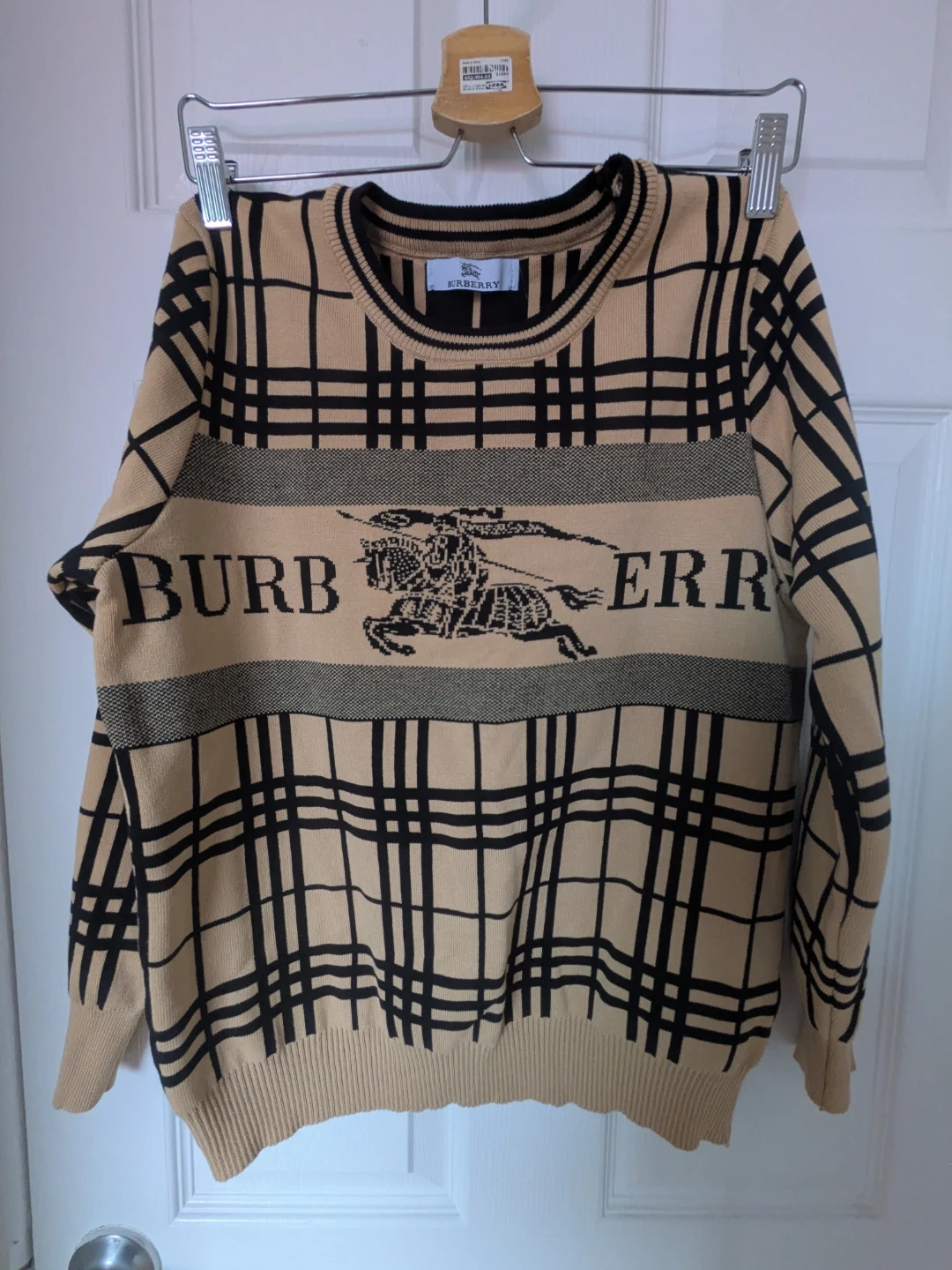 Burberry long sleeve knit sweater with signature plaid pattern. Features the iconic Burberry knight logo and "BURBERRY" text across the chest. Material is a comfortable blend for everyday wear. This stylish knit would be a great addition to any wardrobe!