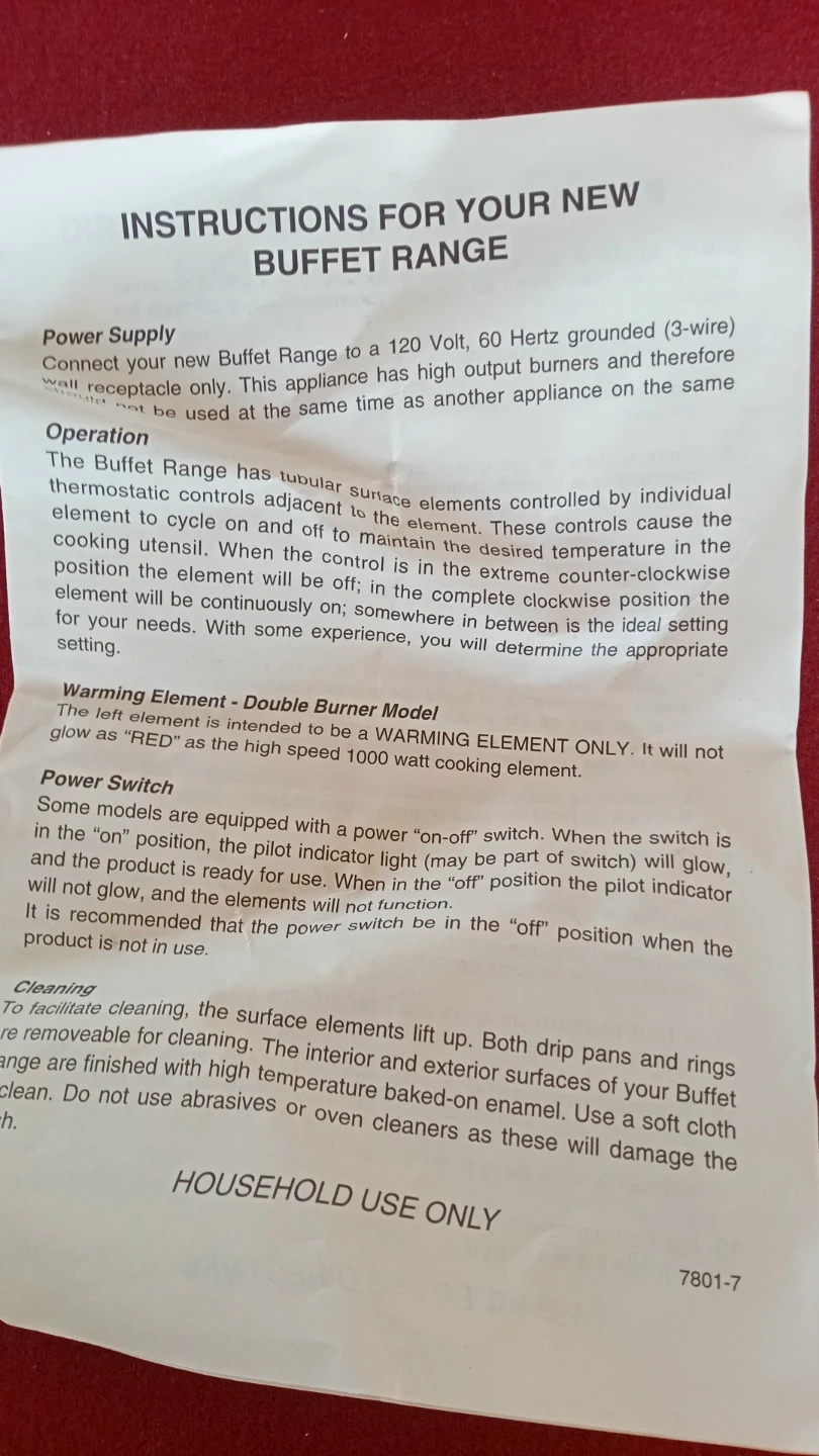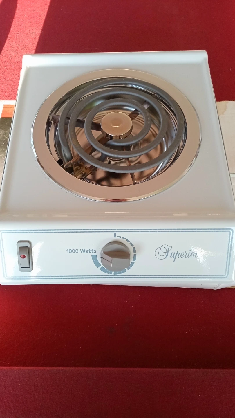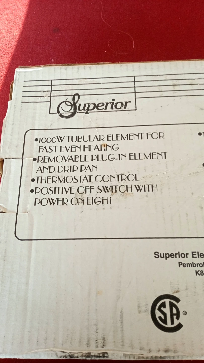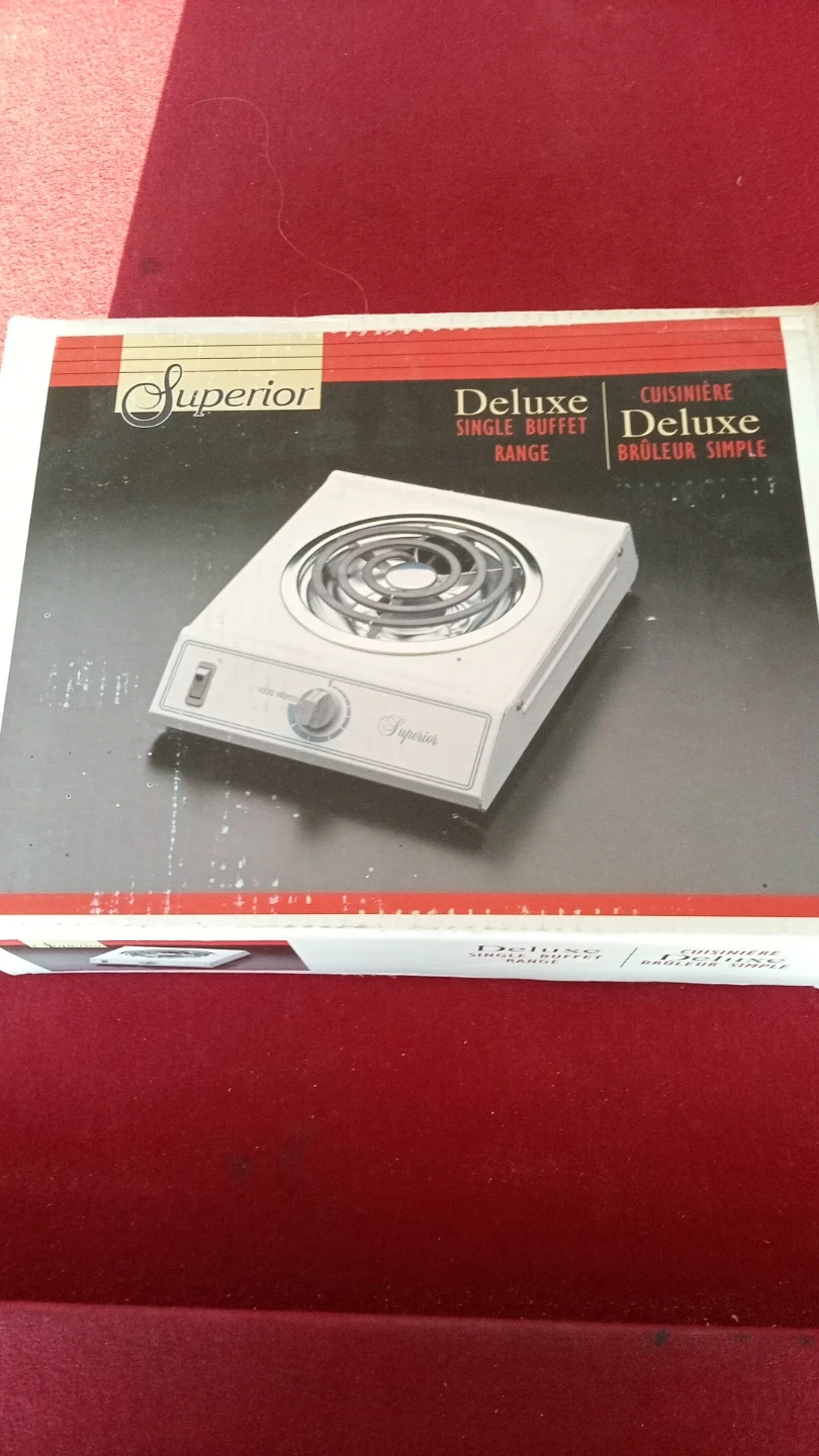 Superior Electric buffet range with a 1000W tubular element for fast, even heating. It features a removable plug-in element and drip pan. Thermostat control and a positive off switch with a power on light.