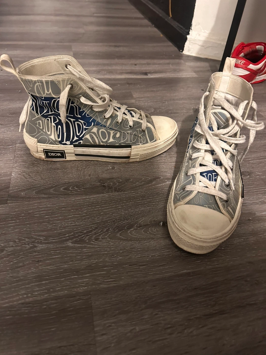 Selling a pair of Dior high-top sneakers! They have a unique design with the Dior logo displayed throughout. They're in used condition, as you can see in the photos.