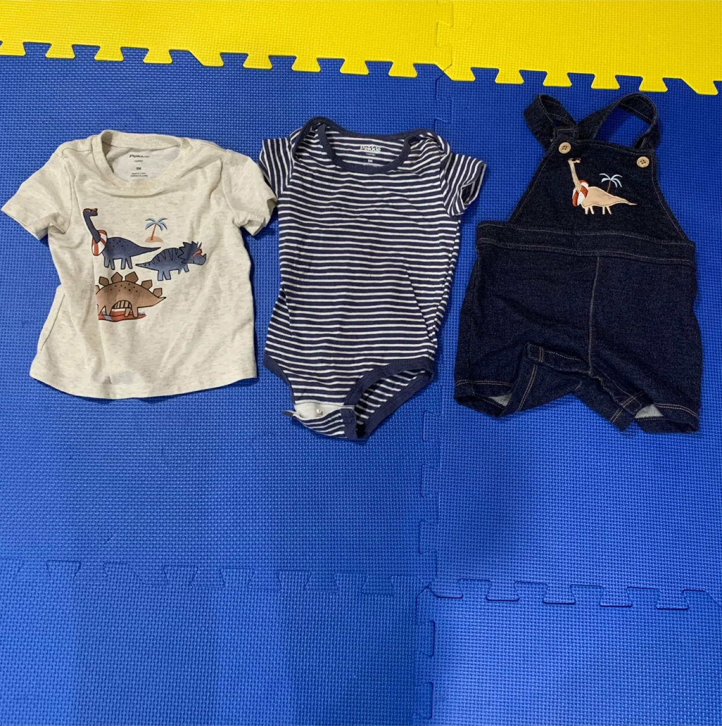 4) A three piece dinosaur outfit- overall , T shirt , shirt sleeve bodysuit- Pekkle