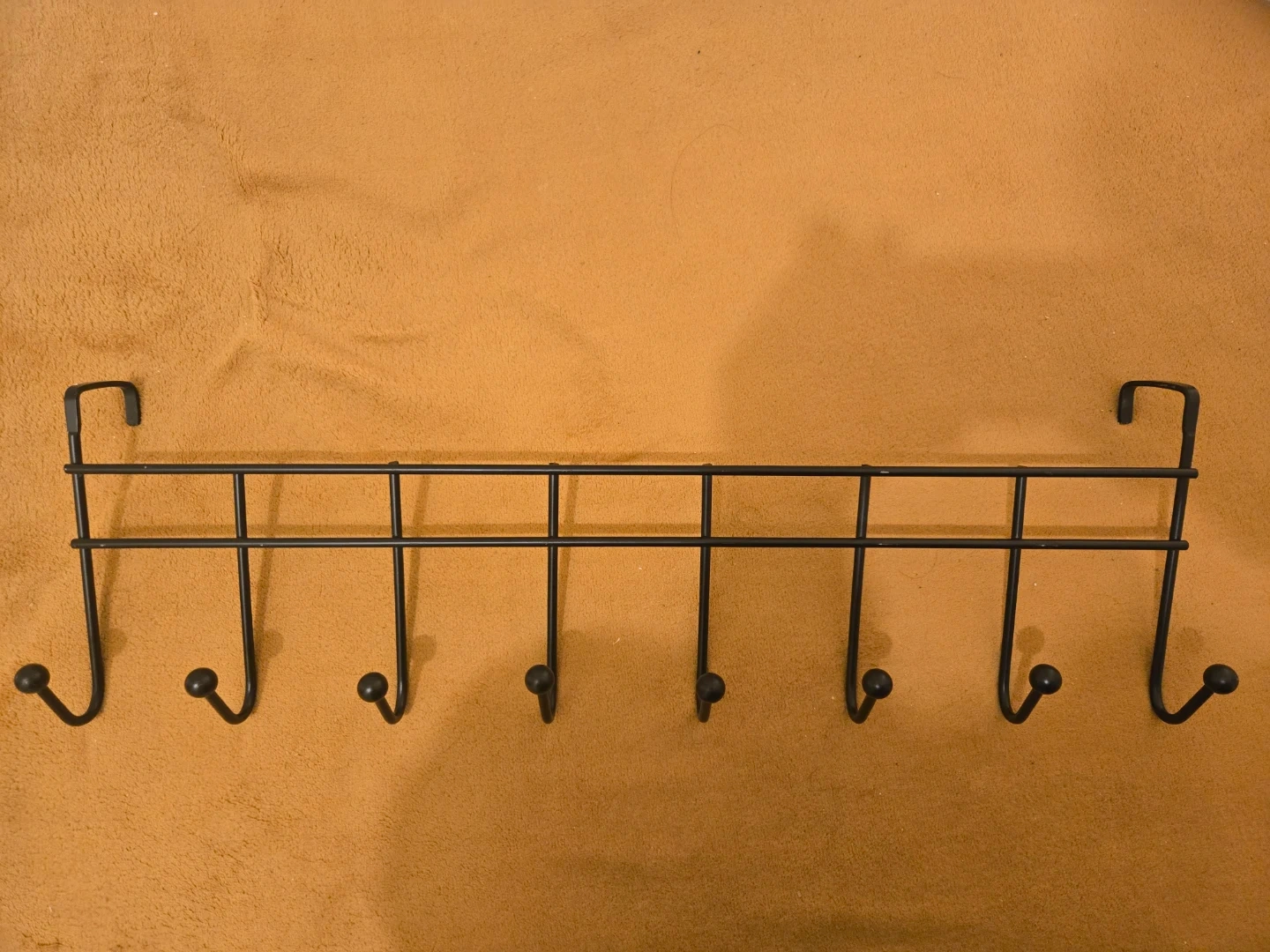 Black metal over-the-door hook rack. It has seven hooks for hanging coats, bags, or other accessories. Made of durable metal. Free with other purchases