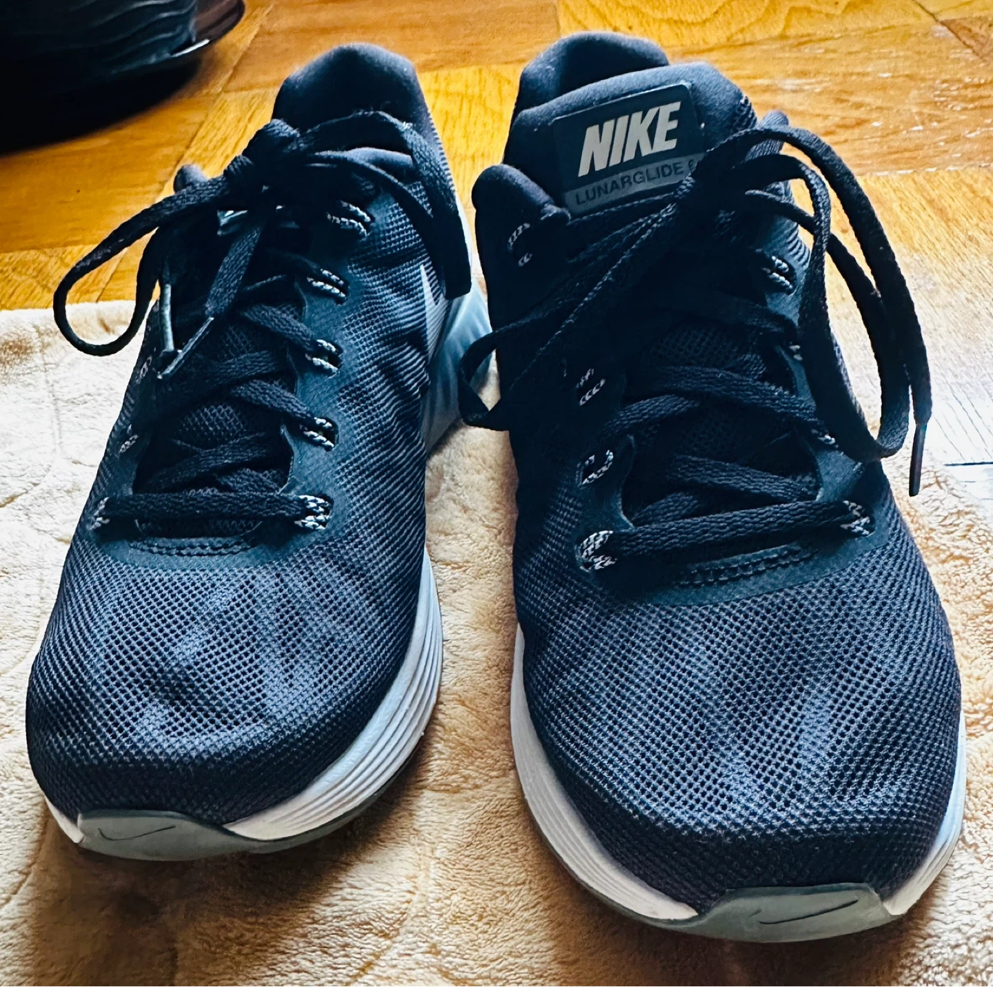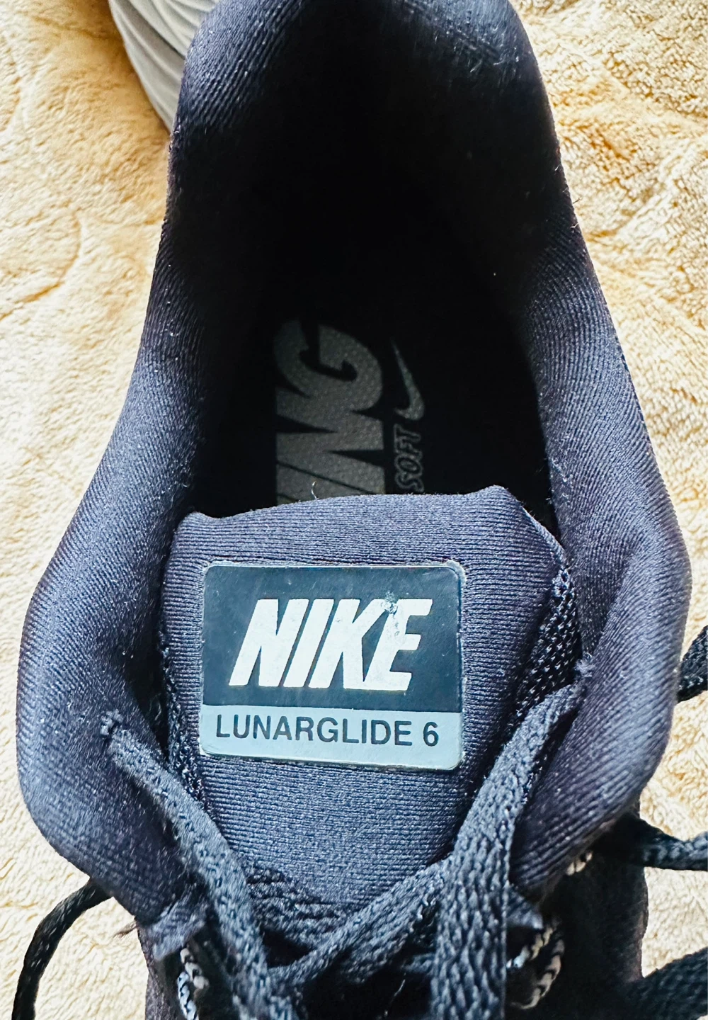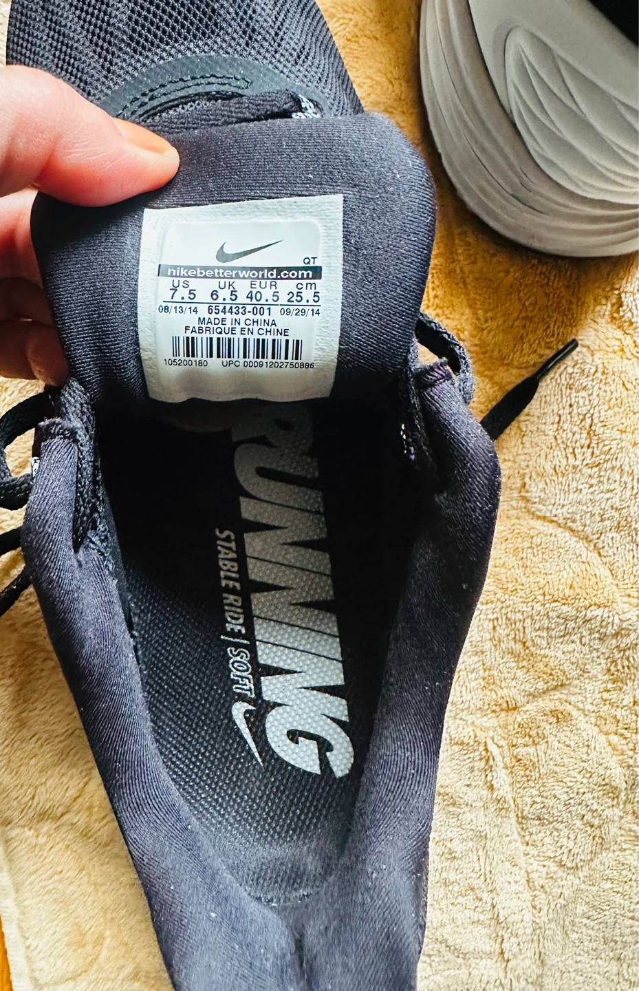 Nike LunarGlide 7 running shoes in black. US Men's size 7.5, UK 6.5, EUR 40.5, 25.5 cm. Stable ride, soft cushioning. Made in China. Manufactured 09/29/14.