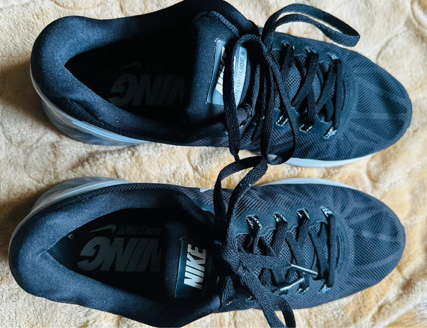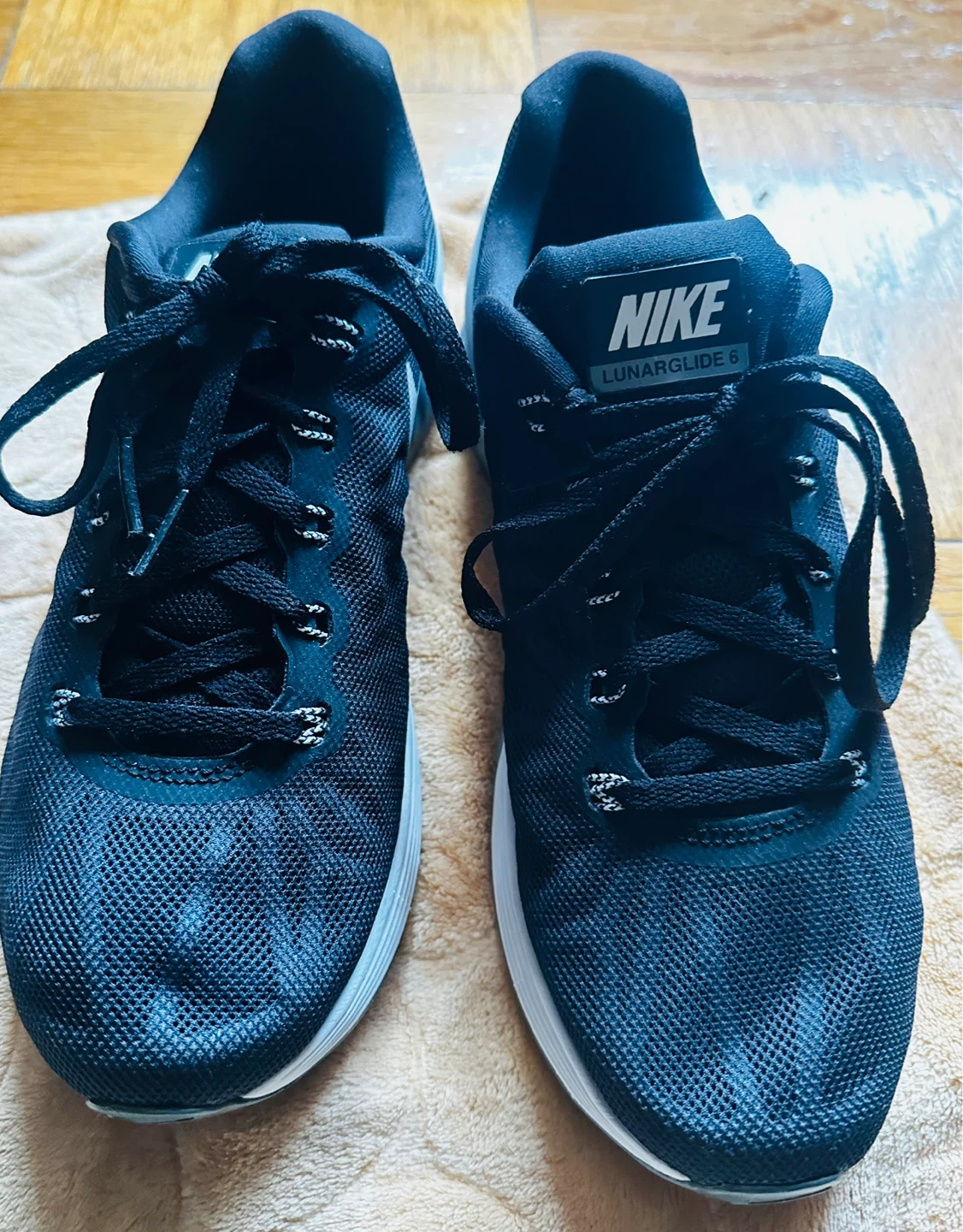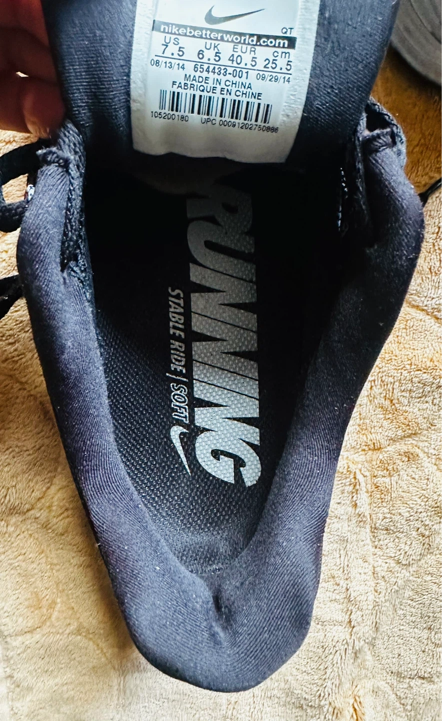 Nike LunarGlide 7 running shoes in black. US Men's size 7.5, UK 6.5, EUR 40.5, 25.5 cm. Stable ride, soft cushioning. Made in China. Manufactured 09/29/14.