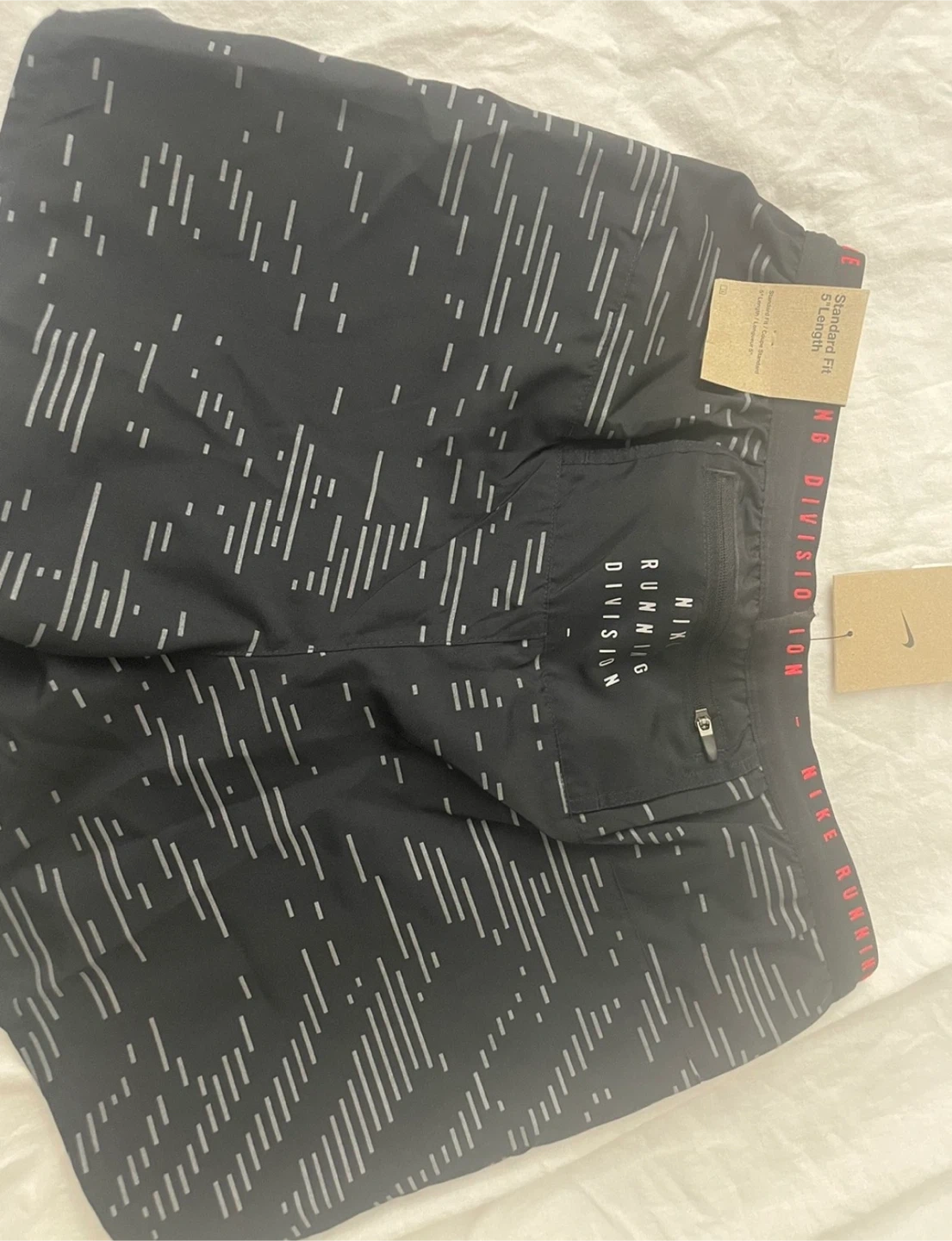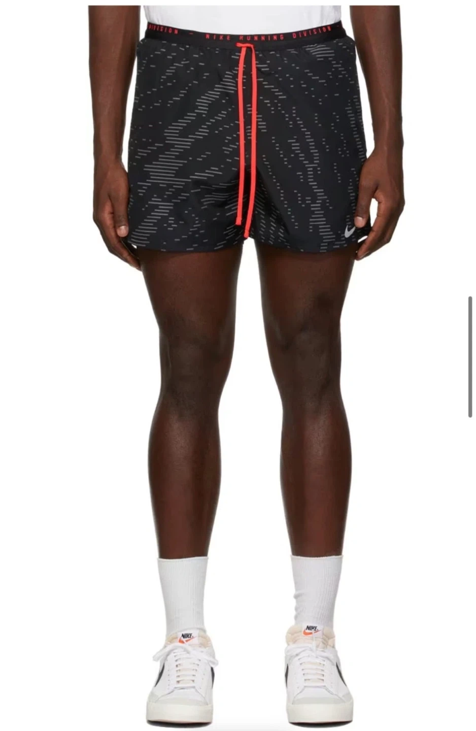 Black running shorts with reflective dash pattern and red drawstring. Features Nike Running Division waistband and a zippered back pocket. Standard fit, 5" inseam.