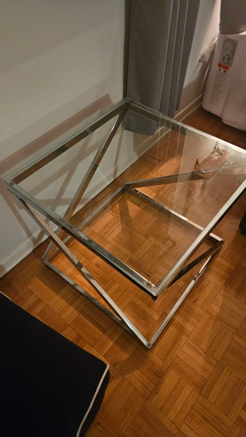 Stylish side table with a chrome base and glass top. It's perfect for placing next to a couch or chair. The unique criss-cross base design adds a modern touch to any living space. It is slightly bent however not very visible (can be seen in the photos)