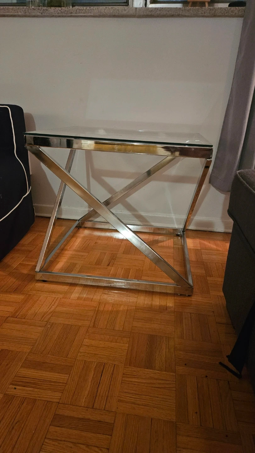 Stylish side table with a chrome base and glass top. It's perfect for placing next to a couch or chair. The unique criss-cross base design adds a modern touch to any living space. It is slightly bent however not very visible (can be seen in the photos)