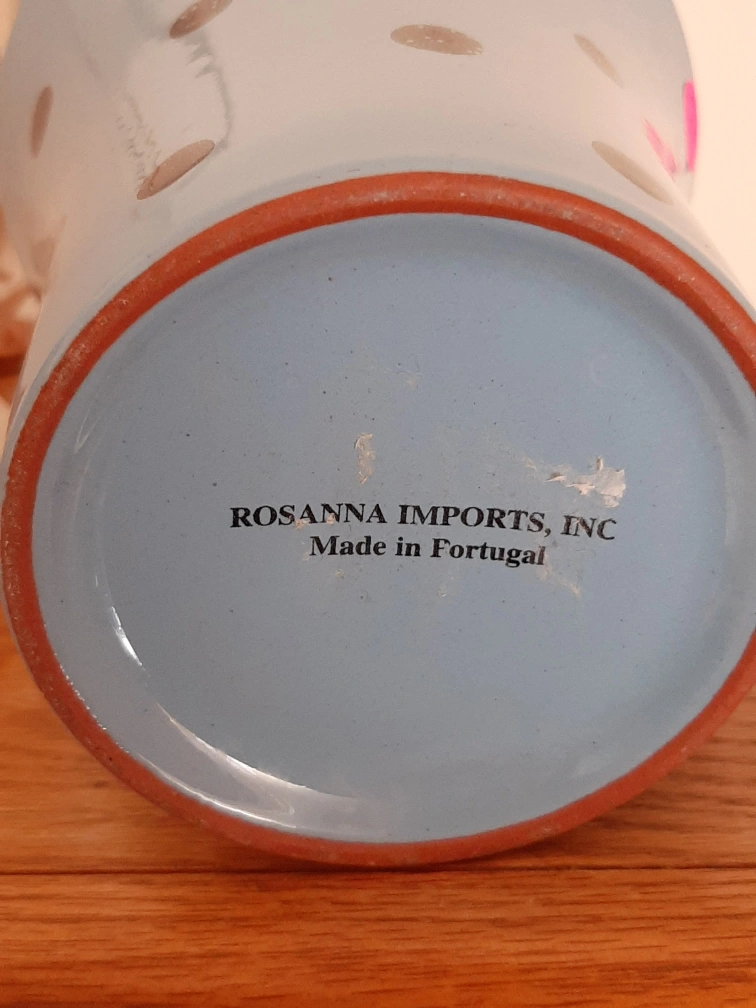 Selling a cute vase from Rosanna Imports! It's a light blue color with brown polka dots and a brown rim. It's made in Portugal and would look great with flowers!