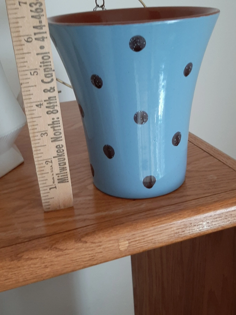 Selling a cute vase from Rosanna Imports! It's a light blue color with brown polka dots and a brown rim. It's made in Portugal and would look great with flowers!