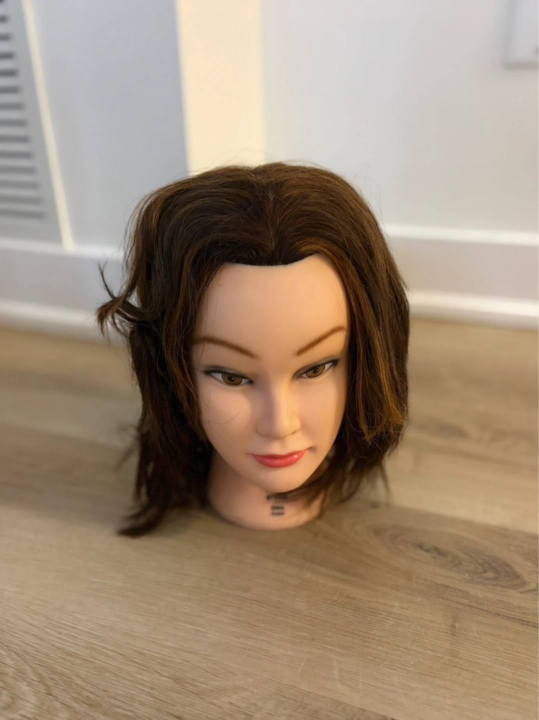 This NP Group "Emma" mannequin head features human hair. It's been chemically bathed and disinfected by steaming. Comes with original box and paperwork.