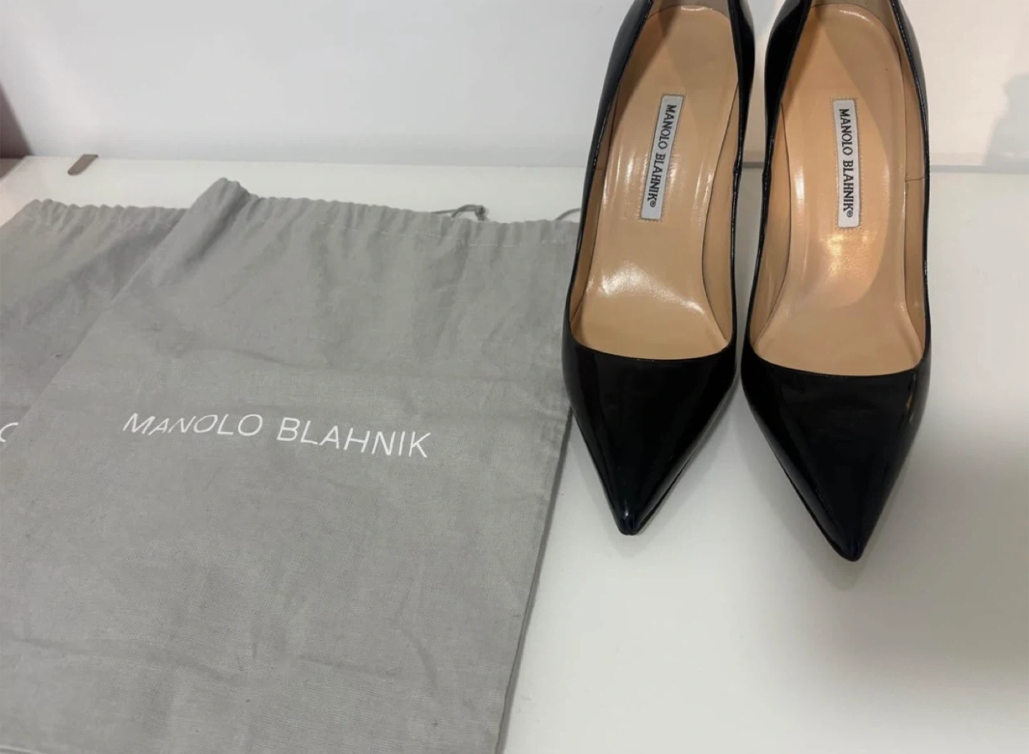 Classic Manolo Blahnik black patent leather pumps. Pointed toe, high heels. Great for dressing up any outfit.
