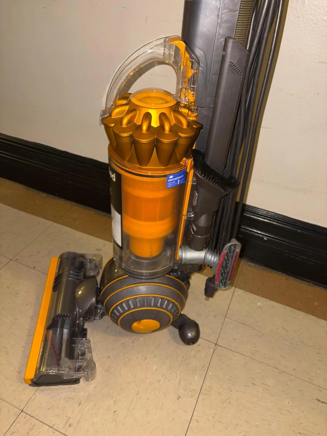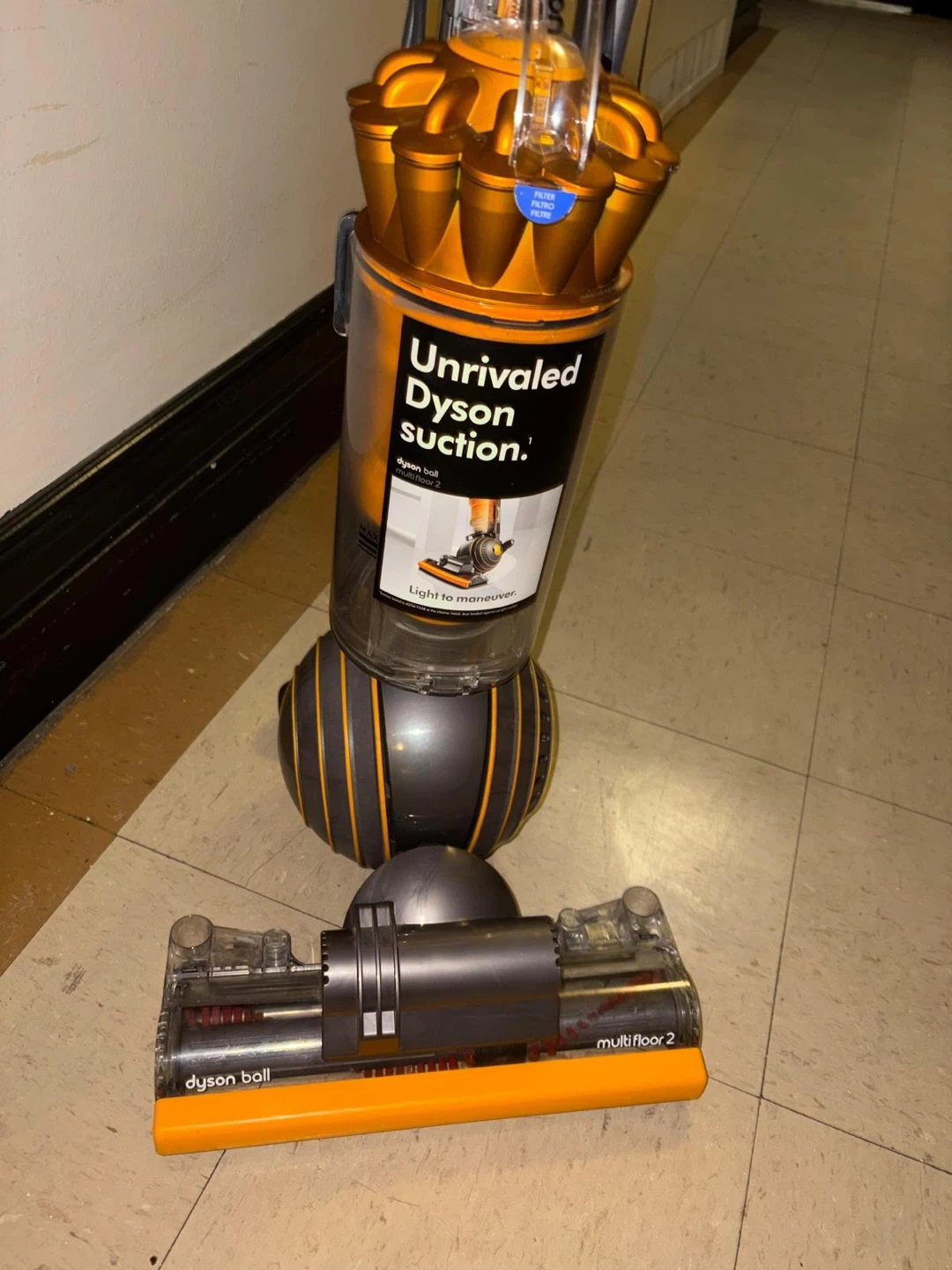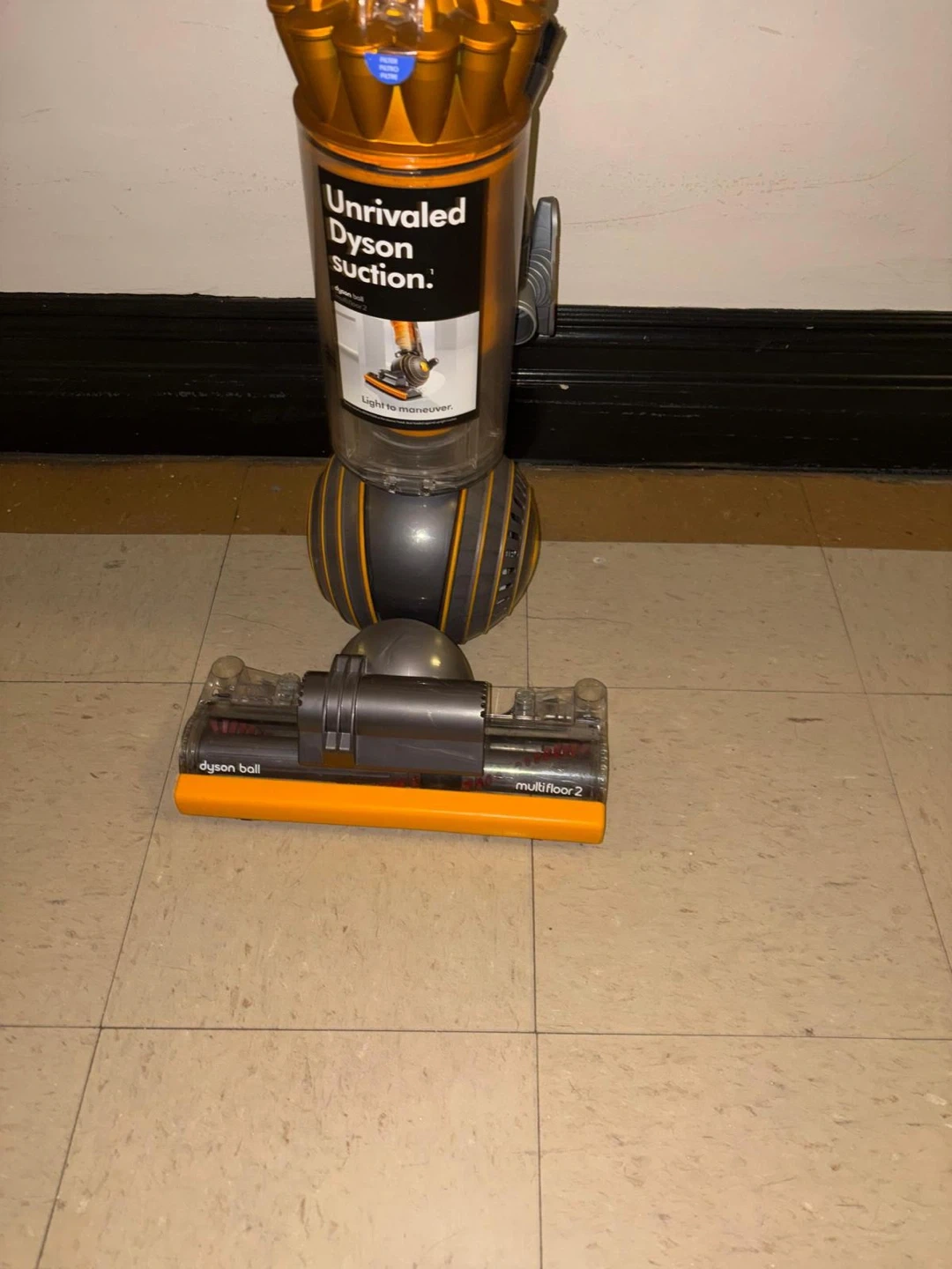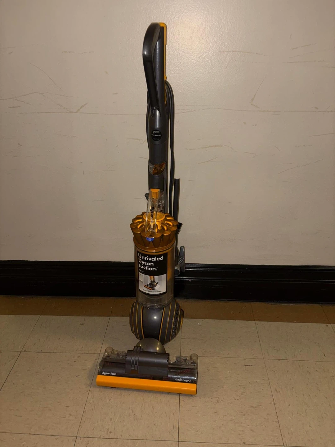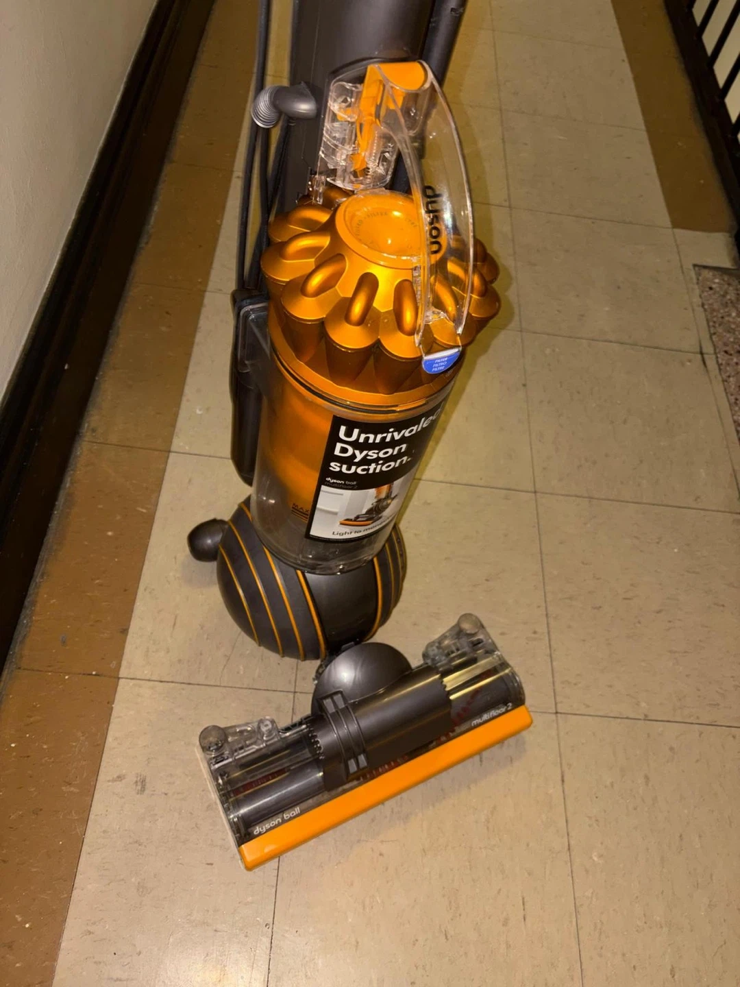 The vacuum cleaner in the image is a Dyson Ball Multi Floor 2 upright vacuum. It is easily maneuverable due to its ball technology and is designed to provide powerful suction across all floor types, including carpet, wood, vinyl, and tile. Key Features Self-Adjusting Cleaner Head: The active base plate automatically raises and lowers to seal in suction, seamlessly adjusting between different floor types. Radial Root Cyclone™ Technology: This patented technology helps capture more microscopic dust and allergens, ensuring no loss of suction. Whole-Machine HEPA Filtration: The advanced filtration system traps allergens and bacteria inside the machine, expelling cleaner air, making it certified asthma and allergy friendly.