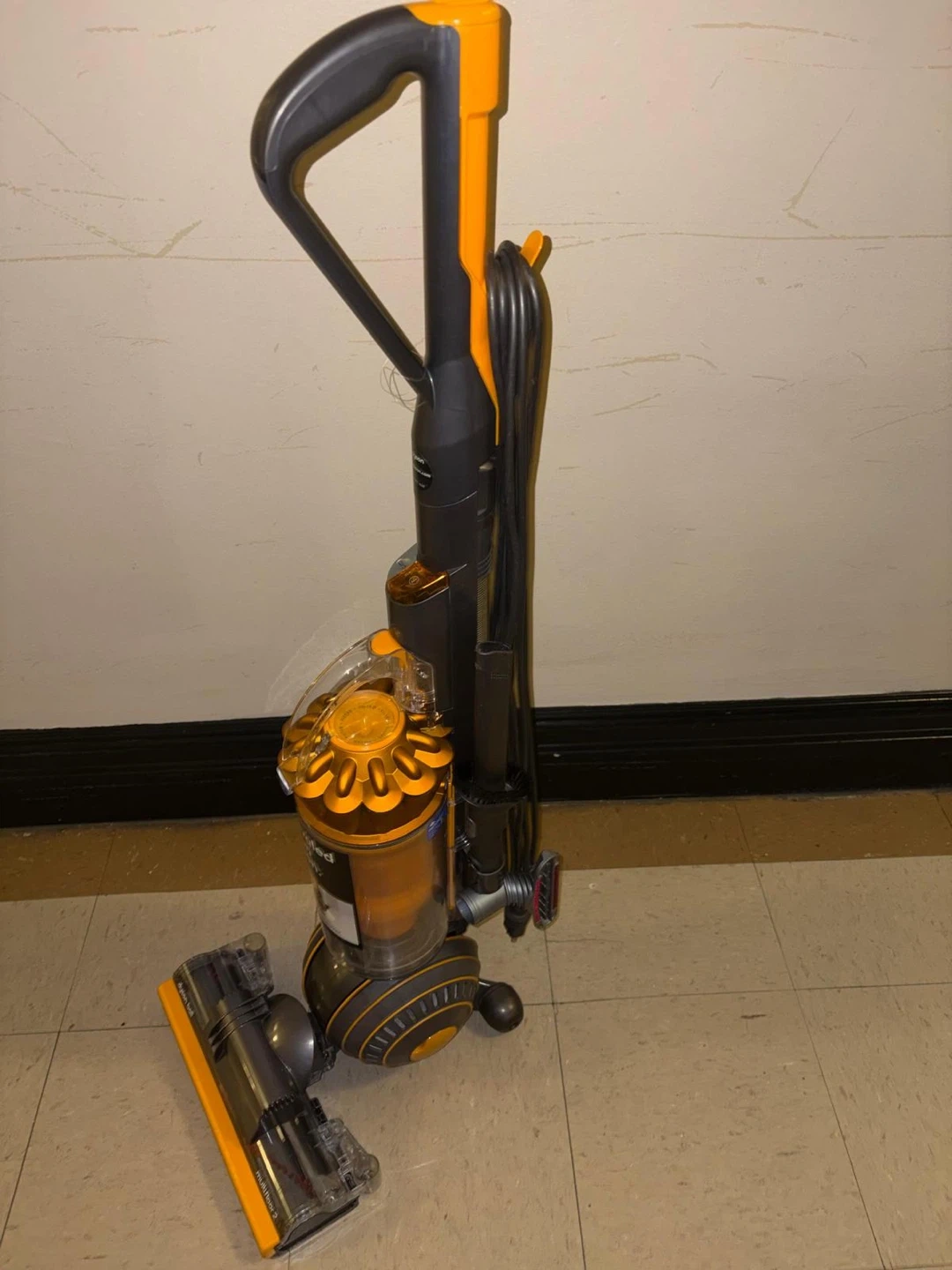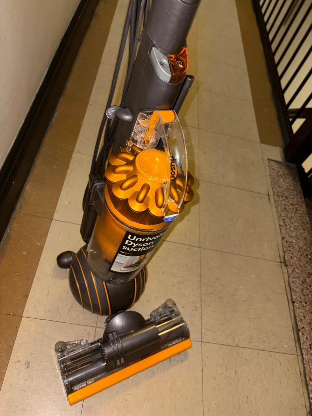 The vacuum cleaner in the image is a Dyson Ball Multi Floor 2 upright vacuum. It is easily maneuverable due to its ball technology and is designed to provide powerful suction across all floor types, including carpet, wood, vinyl, and tile. Key Features Self-Adjusting Cleaner Head: The active base plate automatically raises and lowers to seal in suction, seamlessly adjusting between different floor types. Radial Root Cyclone™ Technology: This patented technology helps capture more microscopic dust and allergens, ensuring no loss of suction. Whole-Machine HEPA Filtration: The advanced filtration system traps allergens and bacteria inside the machine, expelling cleaner air, making it certified asthma and allergy friendly.