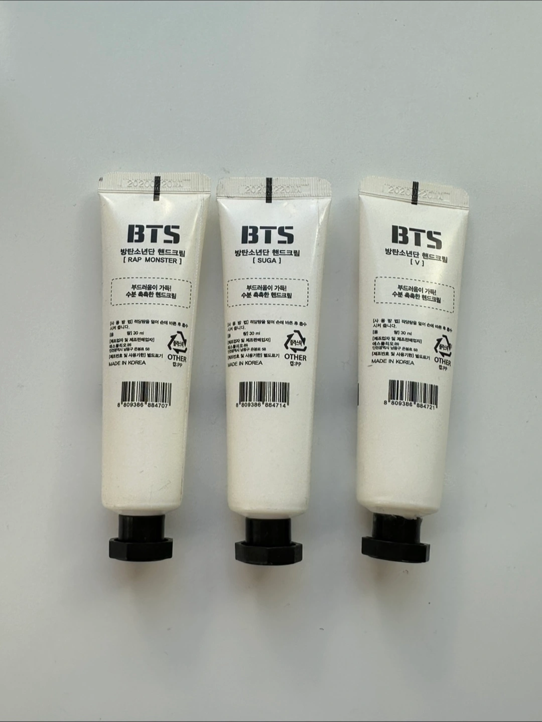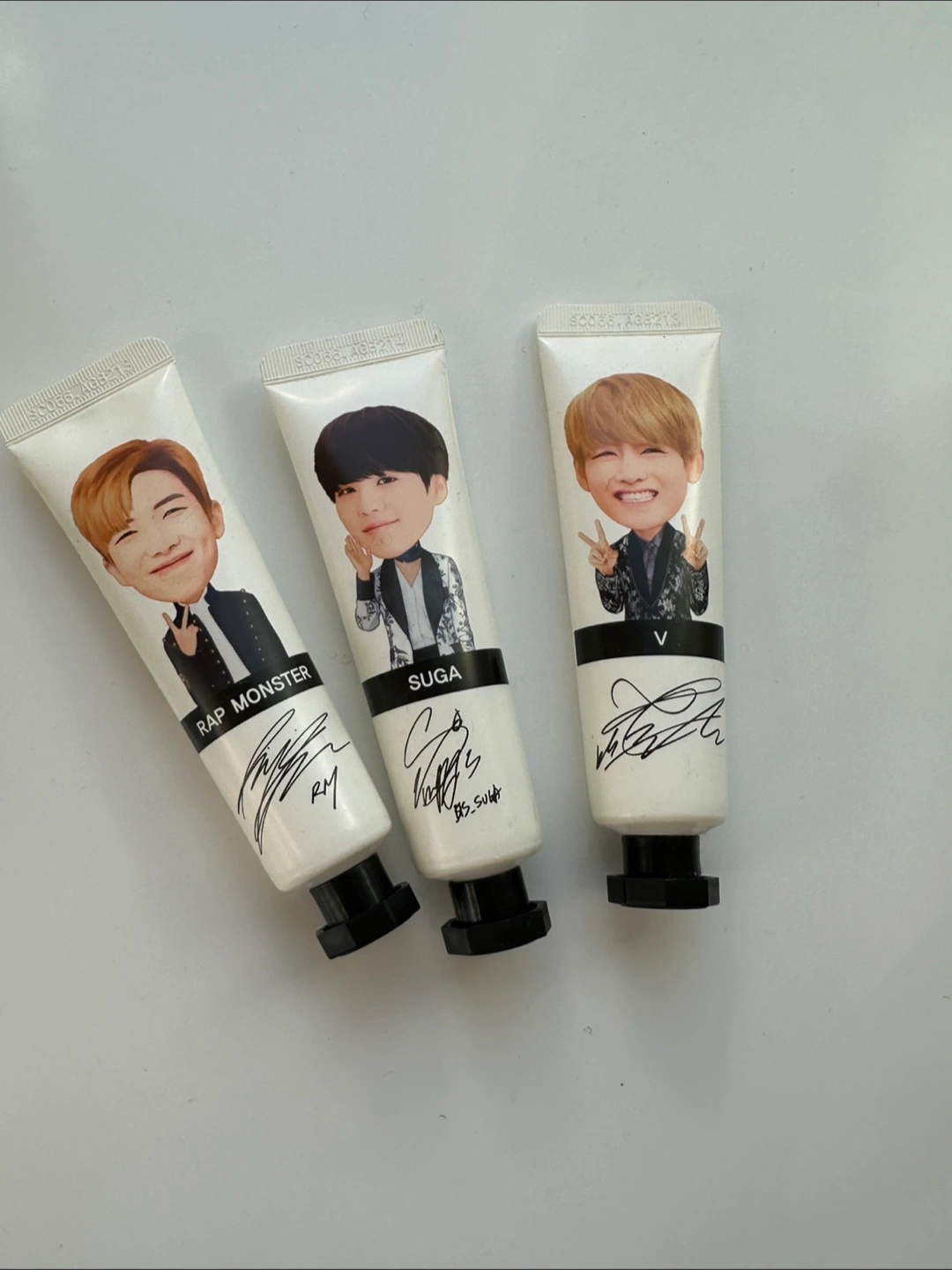 Selling a set of BTS hand creams featuring Rap Monster, Suga, and V! These hand creams are enriched with moisturizing ingredients to keep your hands feeling soft and hydrated