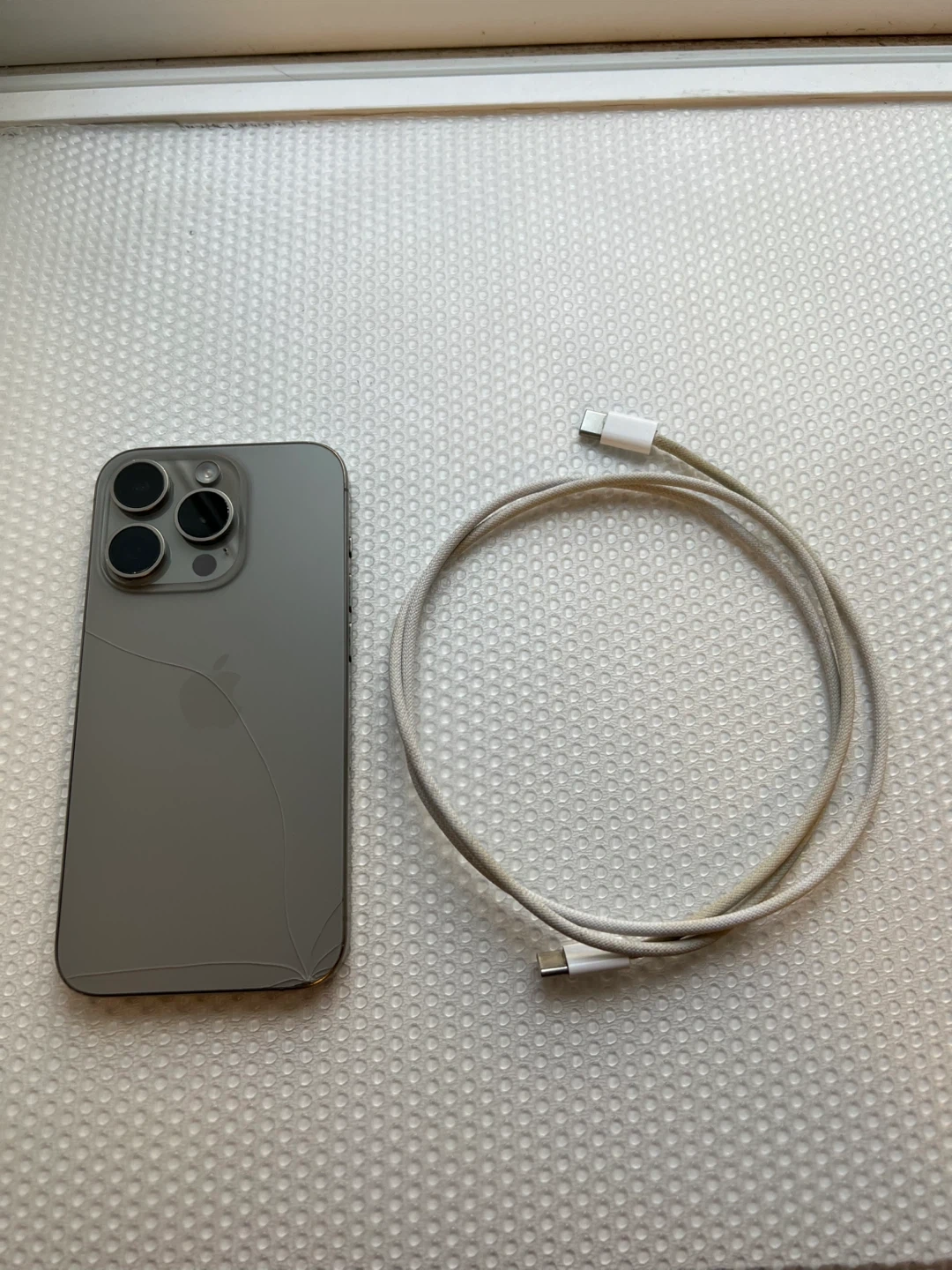 iPhone 15 Pro for sale, perfect condition with only a hairline crack in the rear, has a the genuine original Apple battery which is at 88%