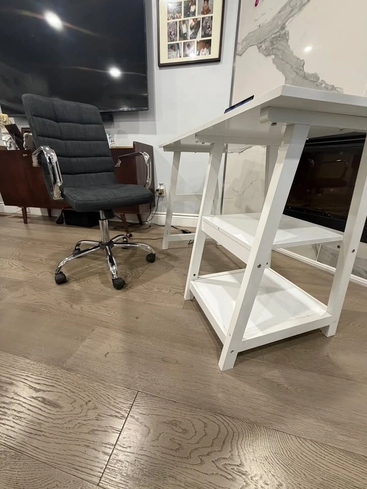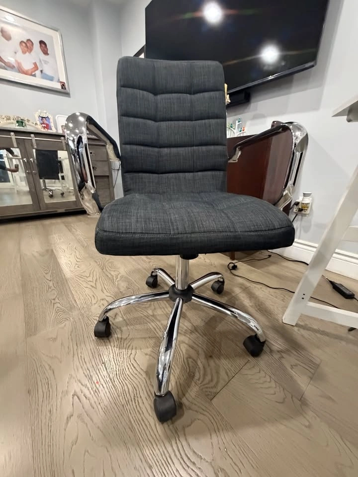 Comfortable and modern grey fabric office chair in good condition. Features durable steel legs and armrests for extra comfort and support. Ideal for a home office, study space, or desk setup.