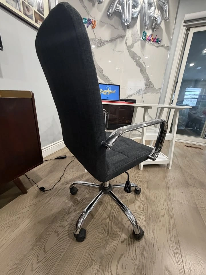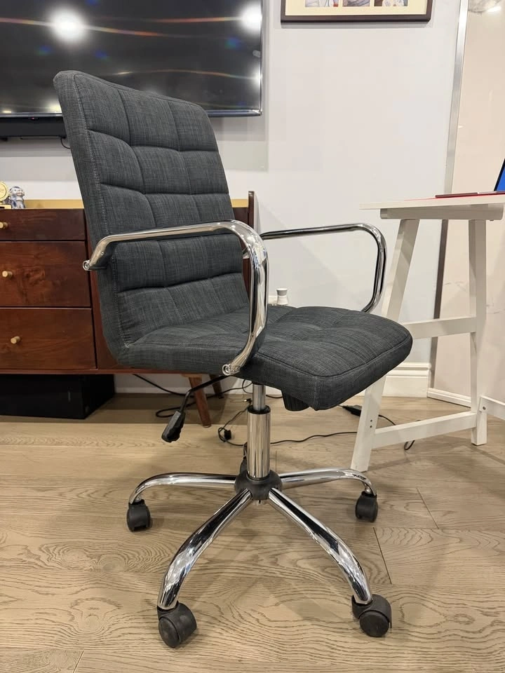 Comfortable and modern grey fabric office chair in good condition. Features durable steel legs and armrests for extra comfort and support. Ideal for a home office, study space, or desk setup.