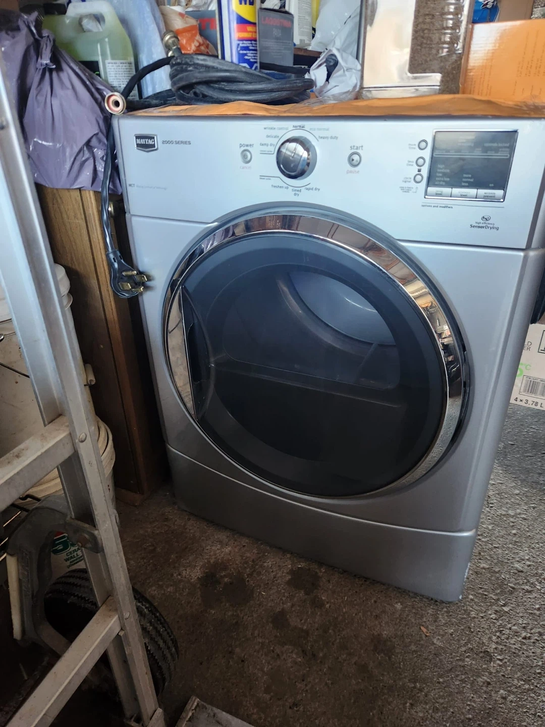 Maytag 5000 Series electric dryer in silver. Features Advanced Moisture Sensing and Steam Refresh cycles. Comes with dryer vent hose. With the Washing Machine. Both are in working condition.