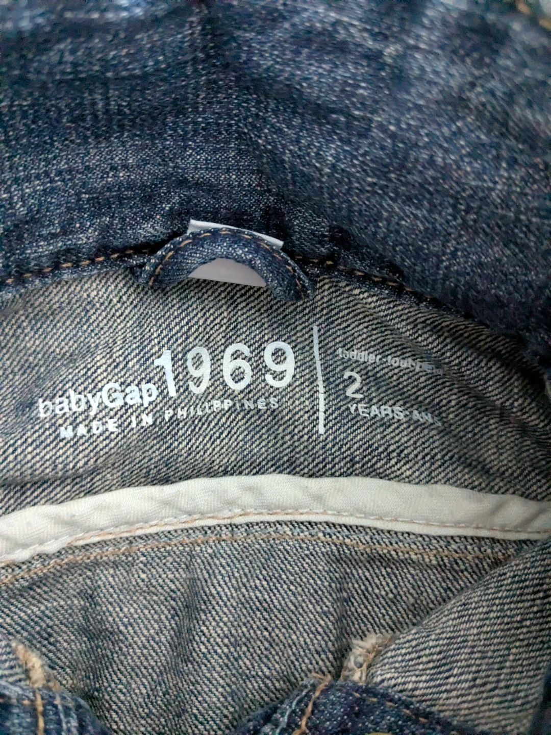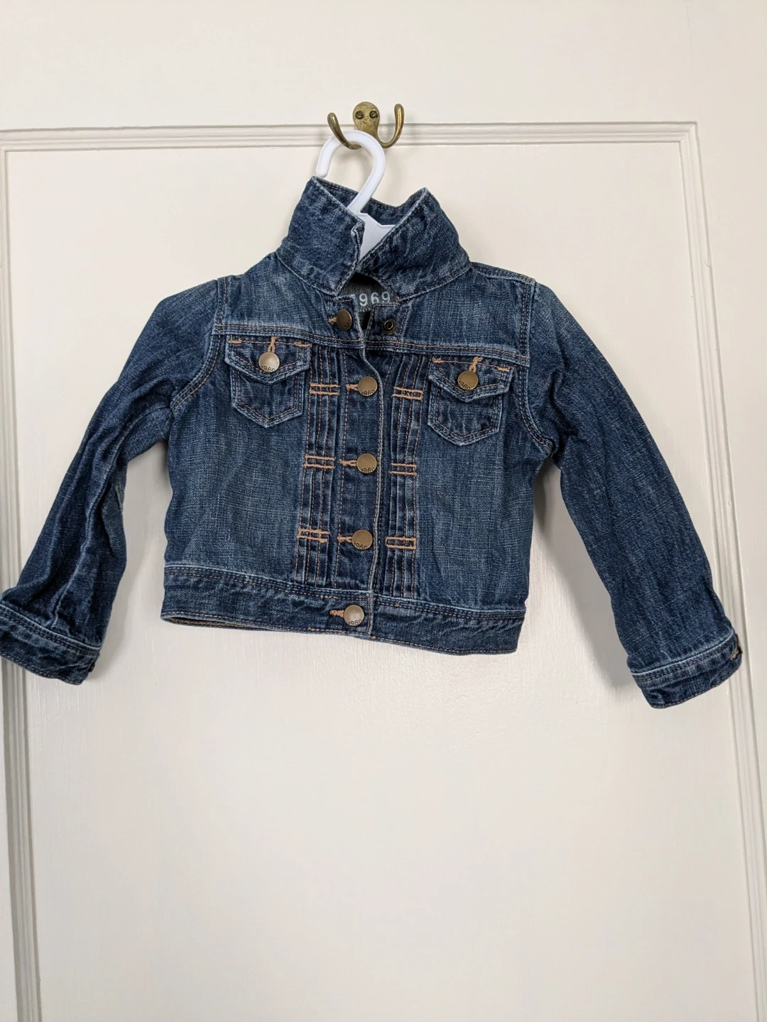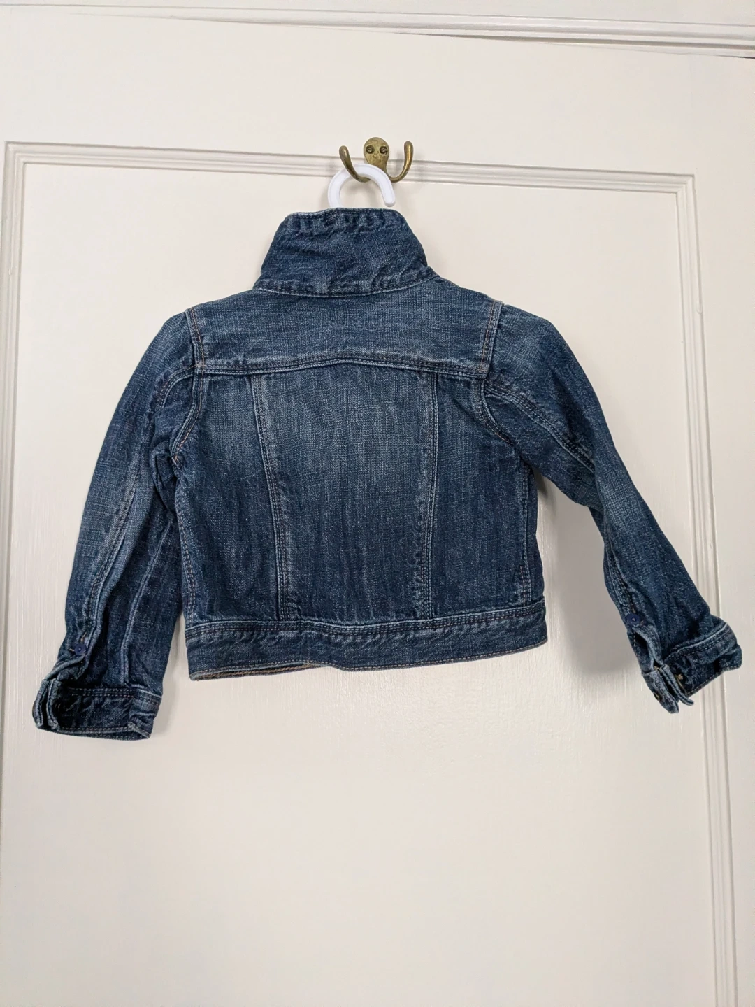 Classic blue denim jacket for toddlers. It features button closures and chest pockets. Made from durable denim material.