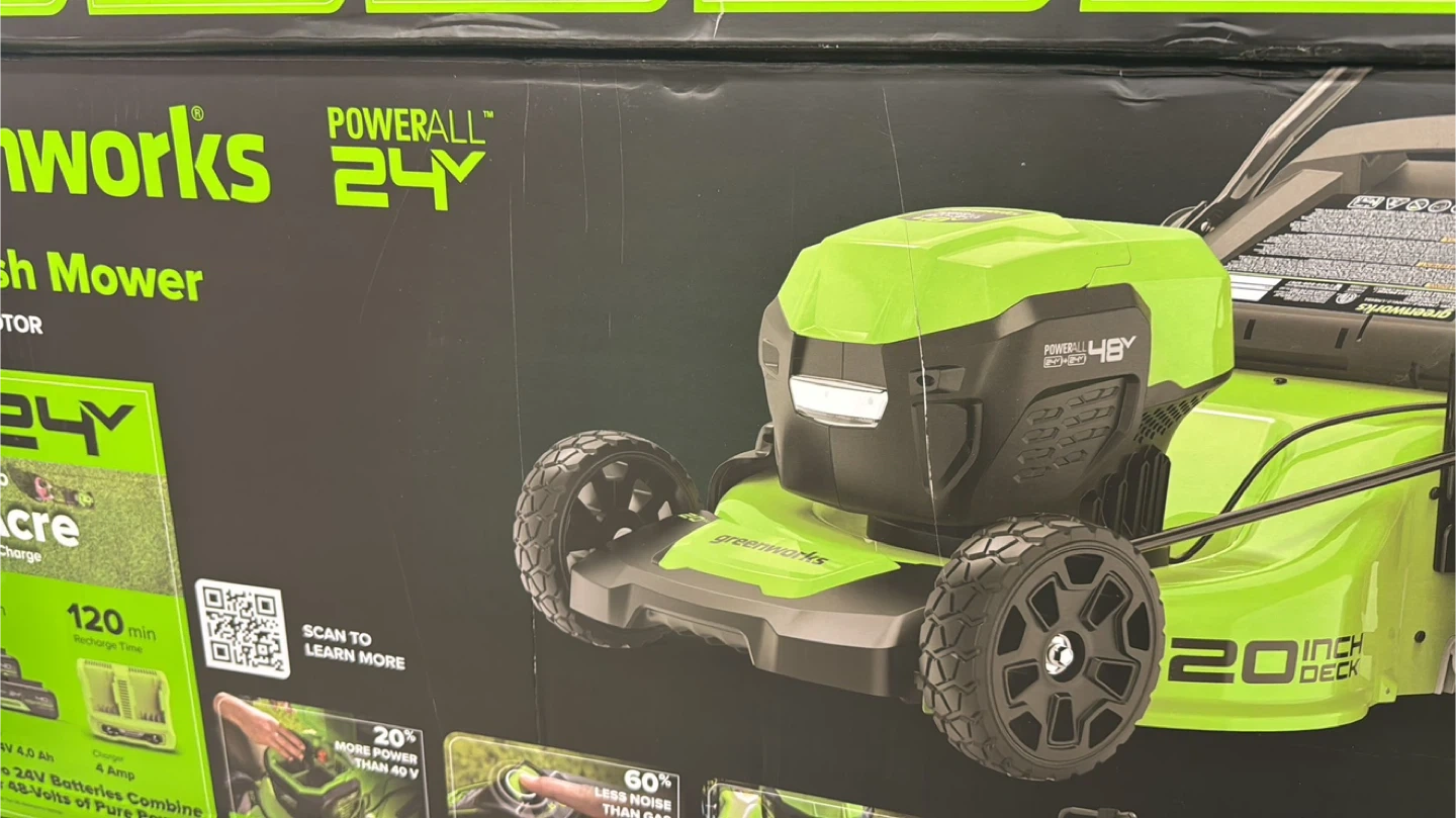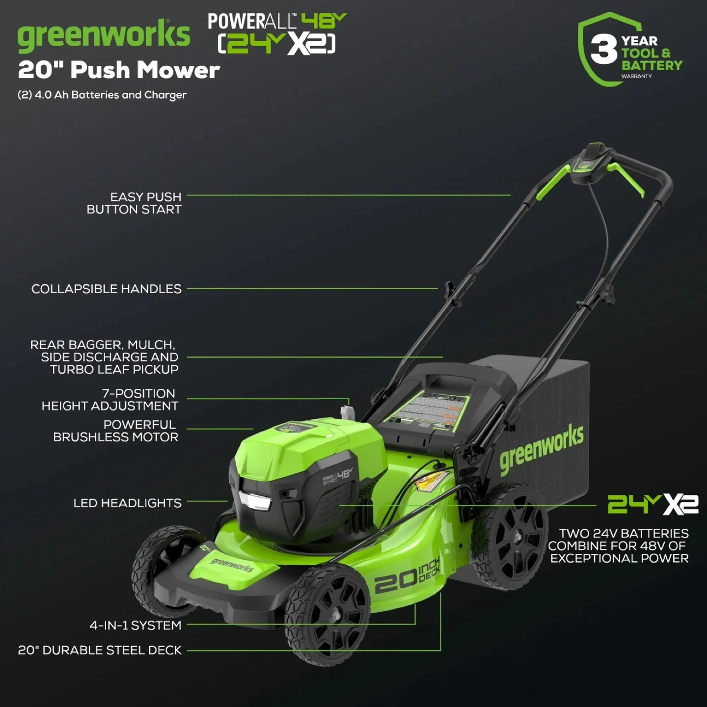 This Greenworks push mower features a 20" durable steel deck and a powerful brushless motor. It's a 4-in-1 system offering rear bagger, mulch, side discharge, and turbo leaf pickup options. Height adjustment is a single lever with 7 positions. Includes two 24V 4.0 Ah batteries and a charger.