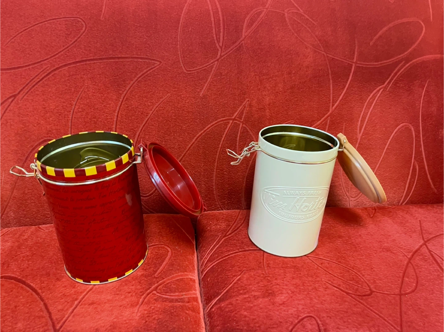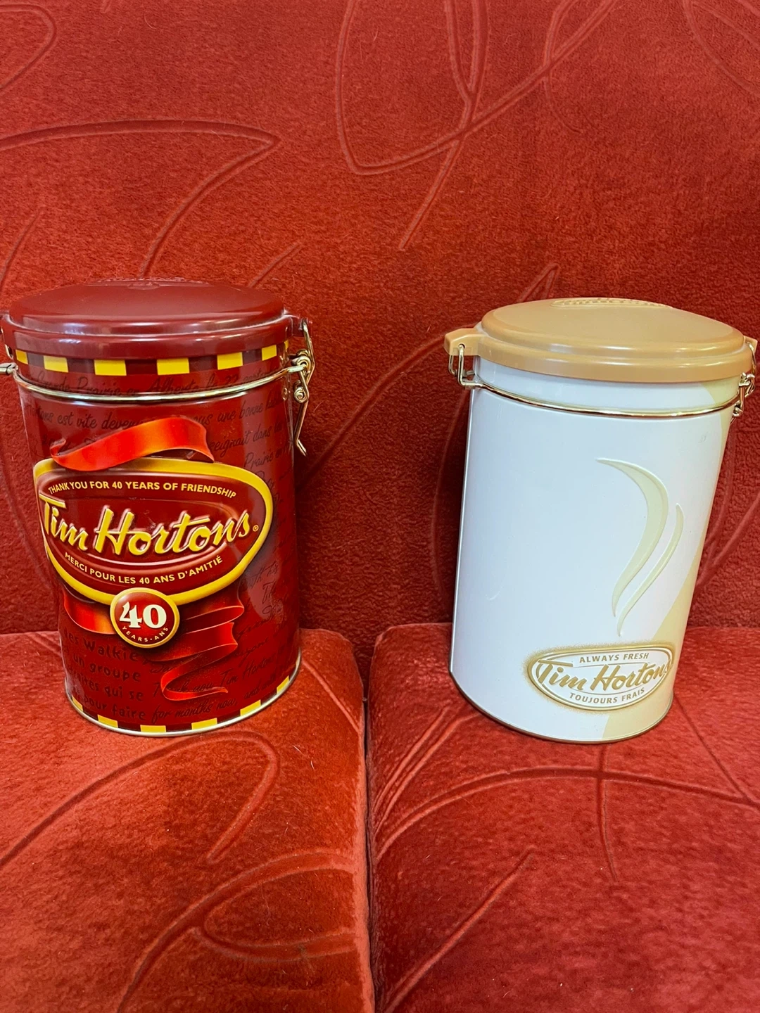 Two Tim Hortons storage tins, one red and one cream. Both feature the Tim Hortons logo. The red tin commemorates 40 years of friendship. They're great for storing coffee, treats, or other kitchen items. Metal construction with a clamp lid. Both empty. 5”D x 7”H. Price is for both. Cash only.