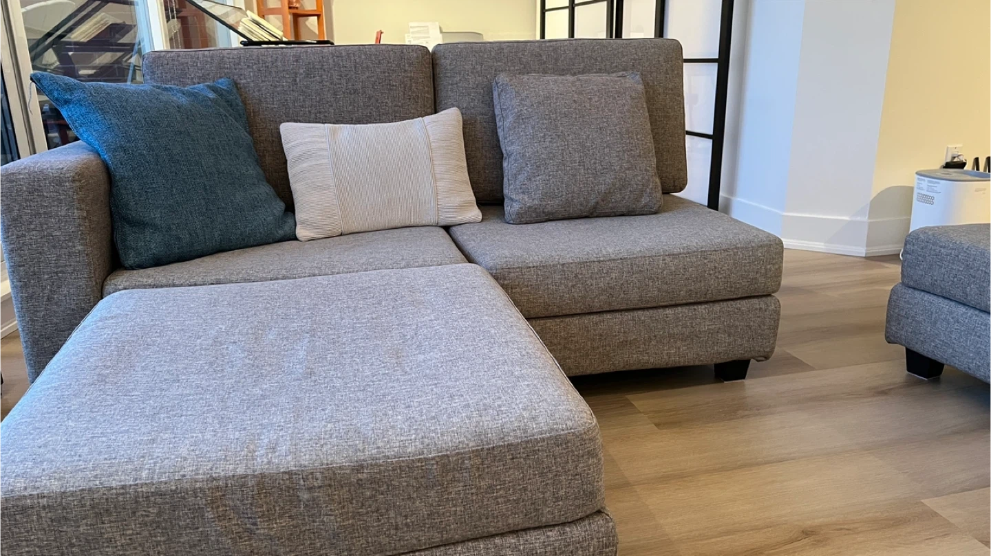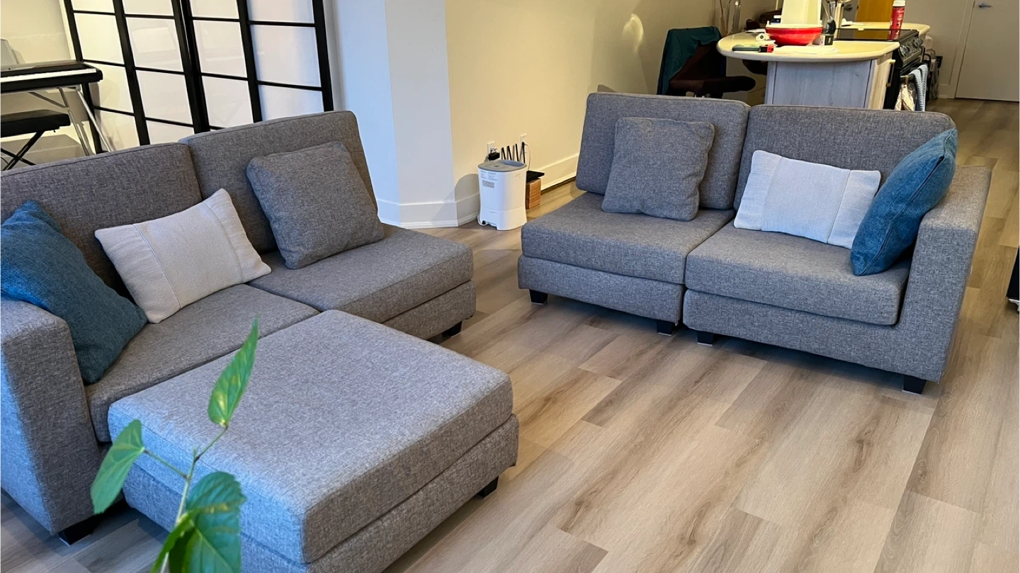 Selling a comfy beige-grey (bark-coloured) modular sectional sofa, complete with an ottoman. It's in good shape and ready to add some cozy vibes to your place! The sectional is super versatile, so you can arrange it however you like. Perfect for lounging! If you are looking for a dark brown sofa instead, this sofa comes with extra covers in that colour. One sectional sofa. Two colour choices.
