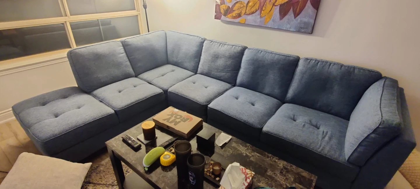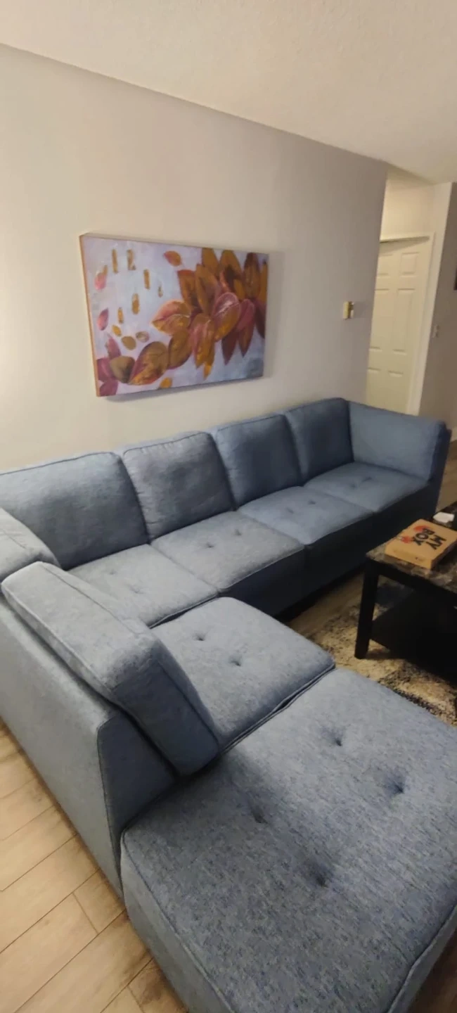 Selling a comfy blue sectional sofa! It's in great condition and would be perfect for a living room or entertainment space. It's very clean and hygienic! The cushions are soft and supportive, making it a great place to relax. It's a stylish and functional piece of furniture!