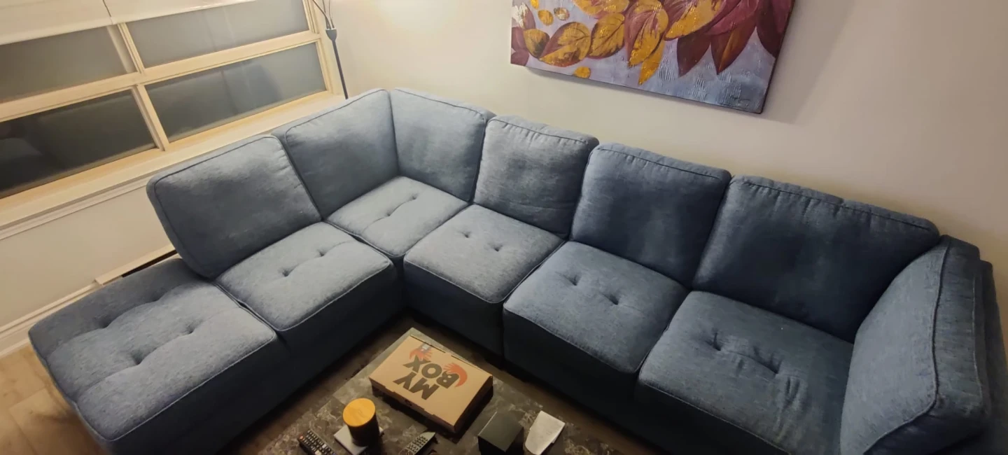 Selling a comfy blue sectional sofa! It's in great condition and would be perfect for a living room or entertainment space. It's very clean and hygienic! The cushions are soft and supportive, making it a great place to relax. It's a stylish and functional piece of furniture!