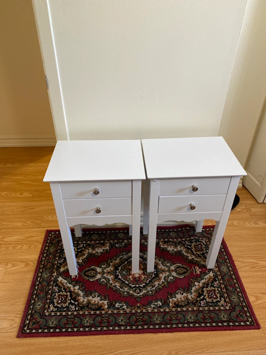 Two white nightstands with two drawers each. I used then once in staging a house as new condition.They're constructed from a wood composite material. Each measures 16 inches wide, approximately 12inches deep, and 25 inches tall. They're perfect for a bedroom or living room /den