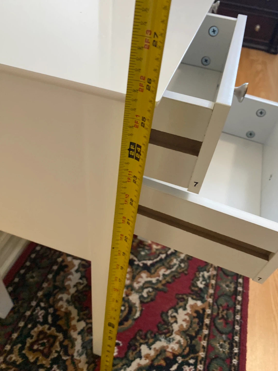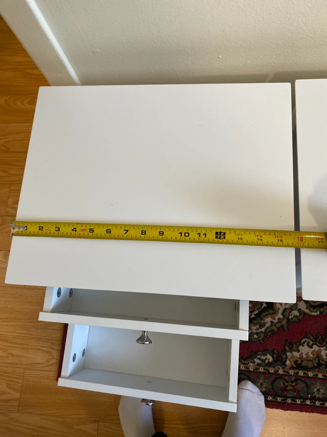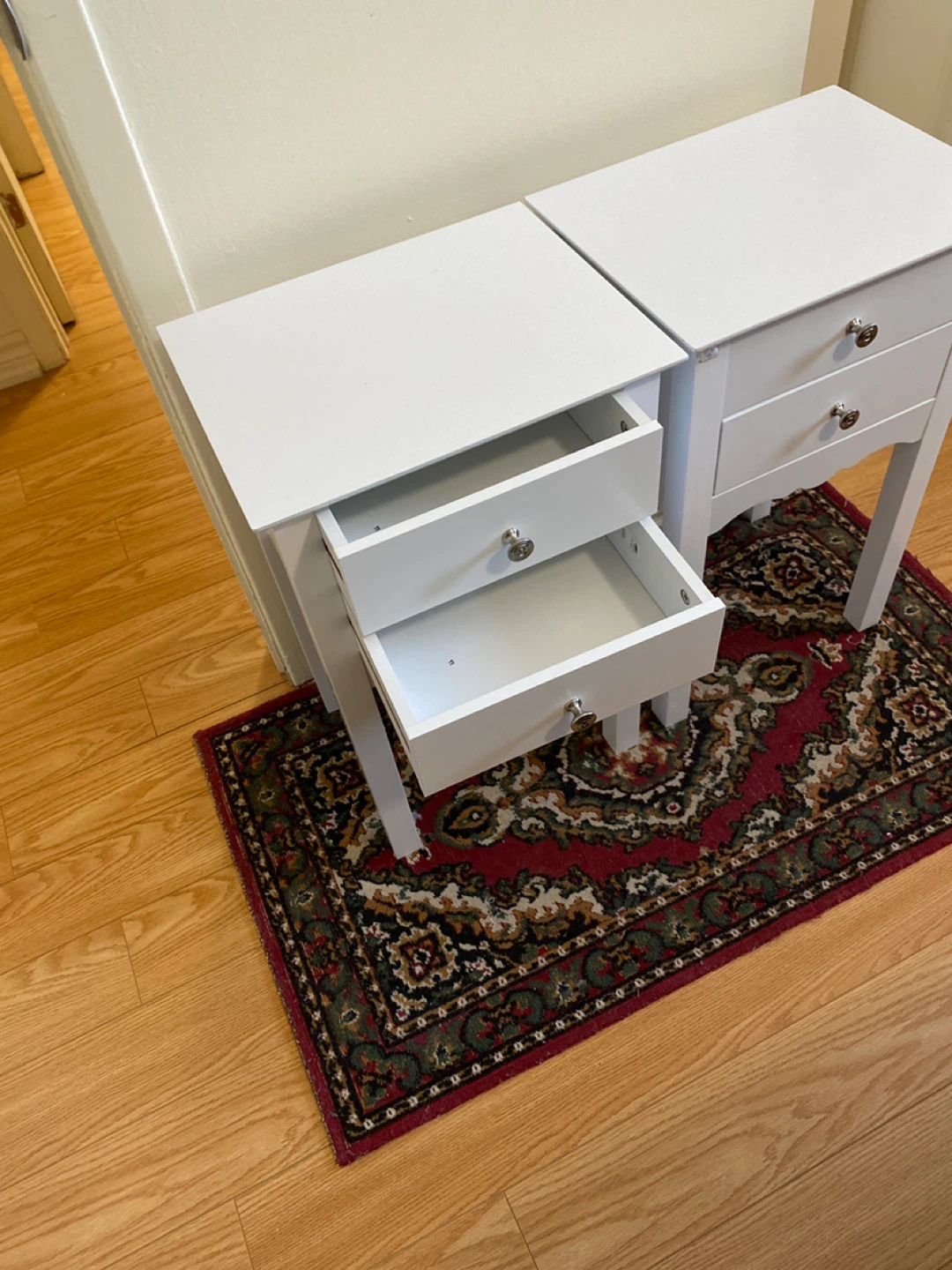 Two white nightstands with two drawers each. I used then once in staging a house as new condition.They're constructed from a wood composite material. Each measures 16 inches wide, approximately 12inches deep, and 25 inches tall. They're perfect for a bedroom or living room /den