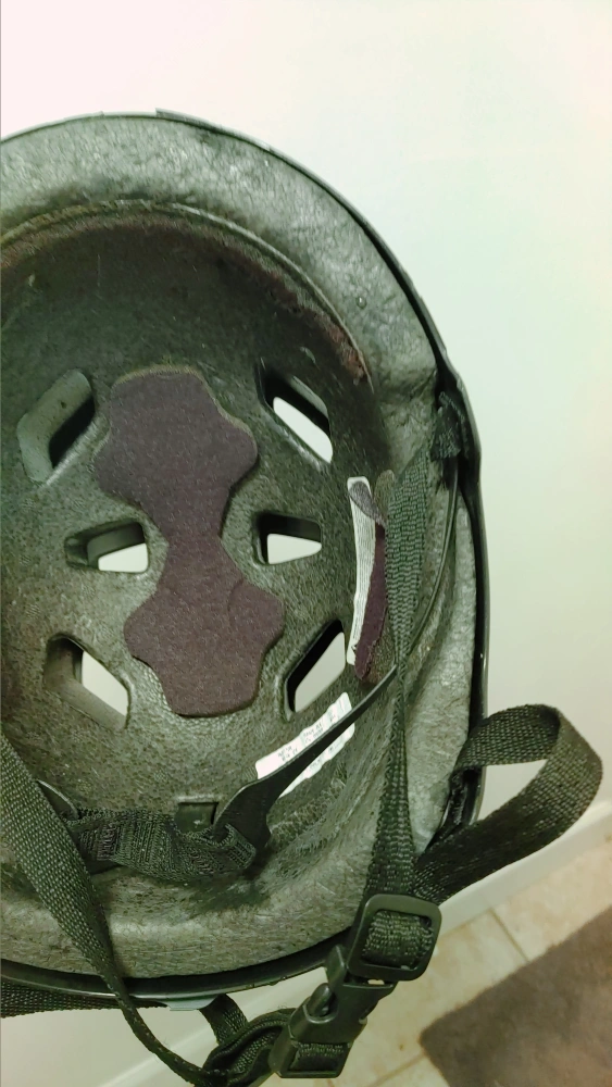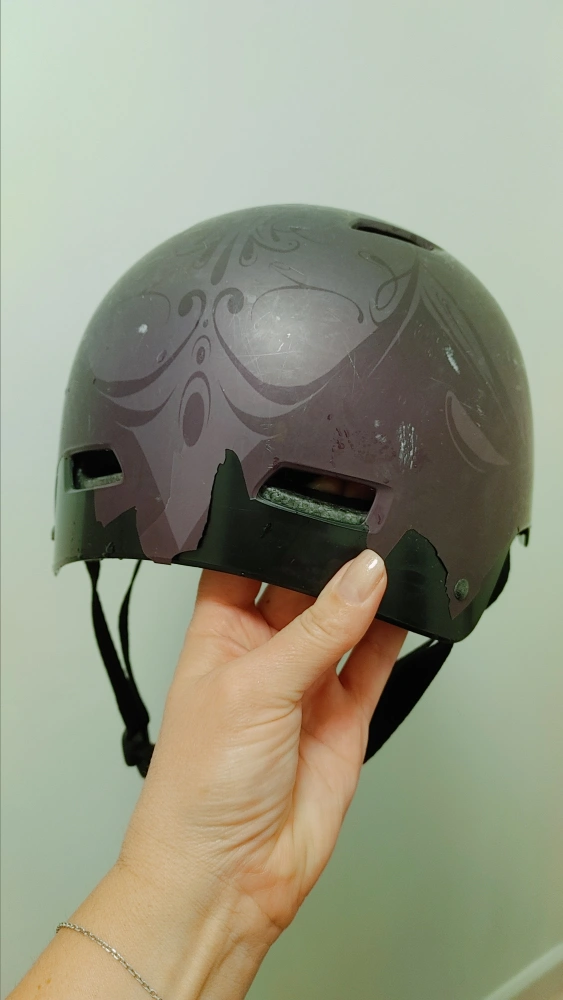 Bell bike helmet with adjustable straps. Good for cycling activities. Helmet has some scuffs and chips but is still functional.