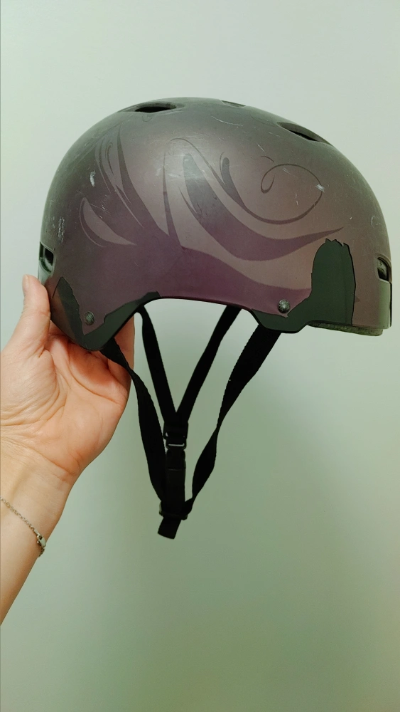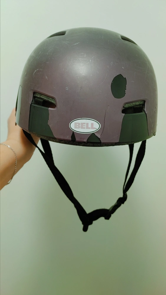 Bell bike helmet with adjustable straps. Good for cycling activities. Helmet has some scuffs and chips but is still functional.