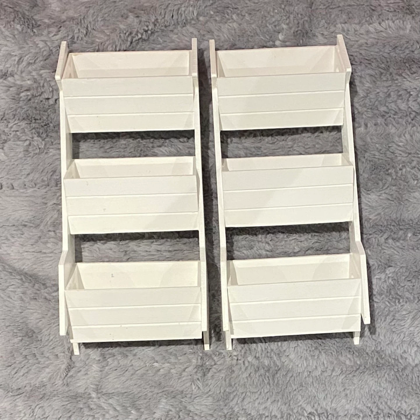 Selling a set of two white tiered wood display shelves. They'd be handy for small plants or organizing! Measure 6”w x 14”h x 4”d/each. Pick up at Weston and Eglinton.