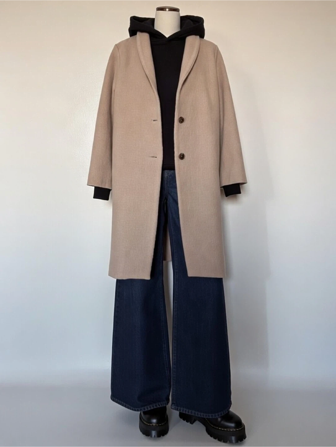 A Wilfred Merinos wool blend coat in a neutral beige colour.