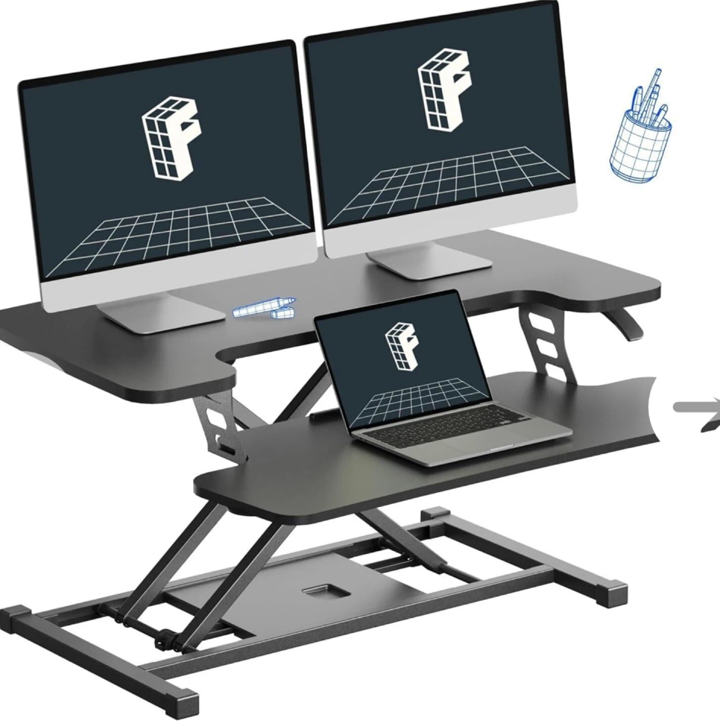 This is a FLEXISPOT 32 inch height desk converter. It allows for quick adjustment between sitting and standing work positions. Its sturdy design supports multiple monitors.