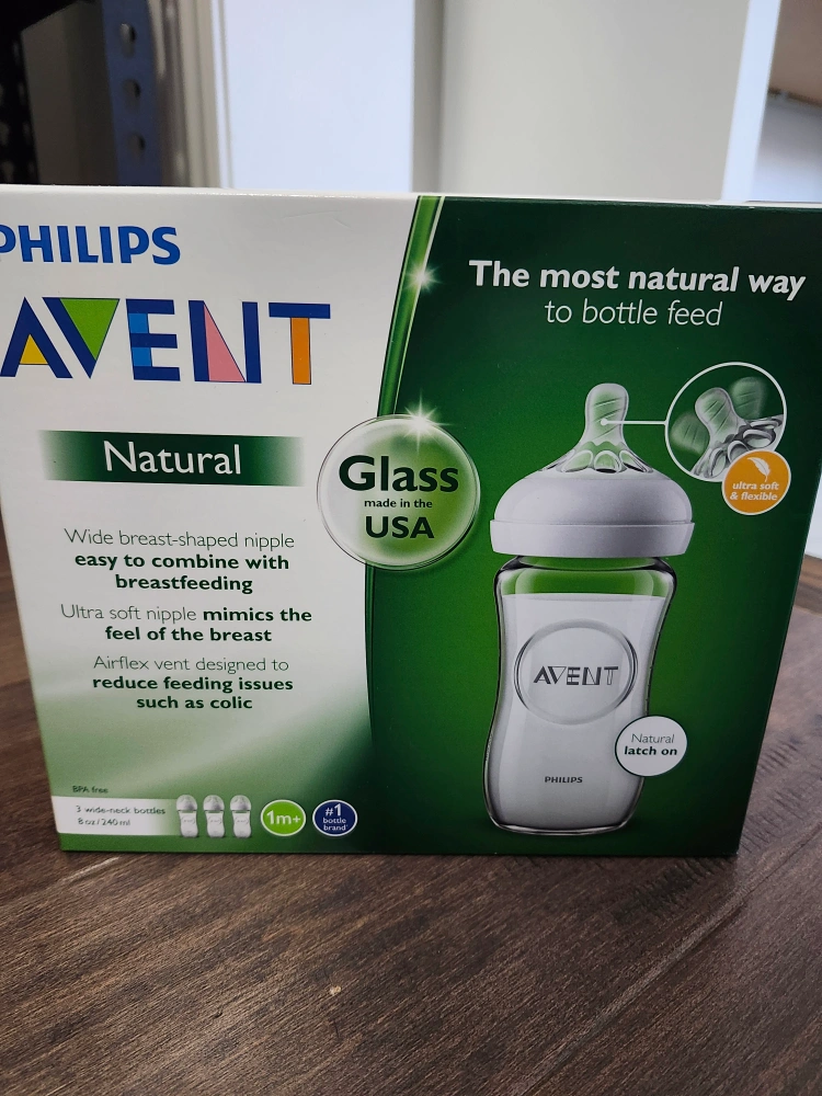 153Selling a brand new Philips Avent Natural glass baby bottle! It's the 8oz size and comes in the original box. - Wide breast-shaped nipple promotes natural latch-on - Ultra soft nipple mimics the feel of the breast - Airflex vent designed to reduce colic and discomfort