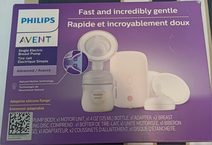 I'm selling a brand new Philips Avent Single Electric Breast Pump! It's fast and incredibly gentle, using natural motion technology. The box includes the pump body, motor unit, a 4oz (125ml) bottle, adapter, and two breasting discs