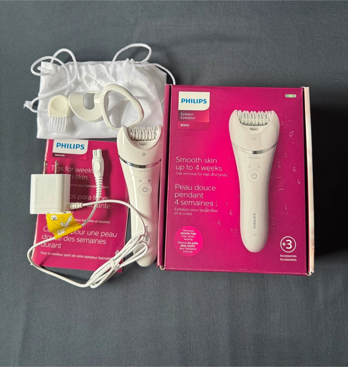 Selling a Philips Epilator 8000. It's in excellent condition and comes with all the original accessories and the box! This epilator provides smooth skin for up to 4 weeks, removing hair from legs and body. It can be used wet or dry for your convenience. Get ready for silky smooth skin!