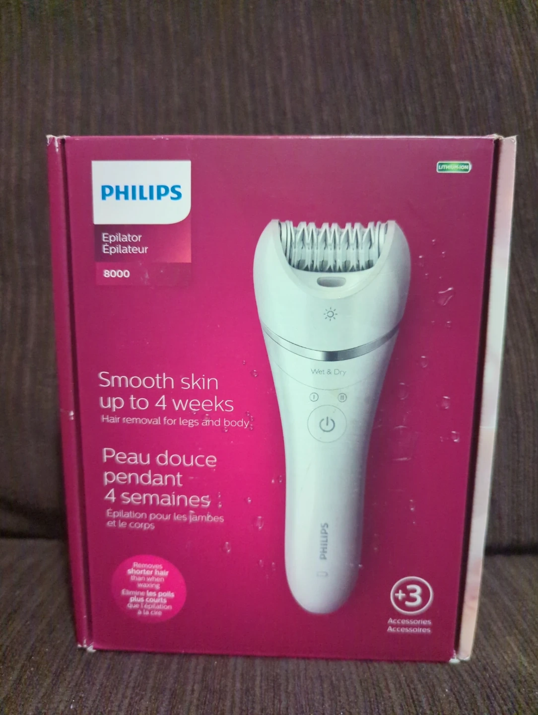 Brand: Philips Female Grooming Colour: White Power source: Battery Powered Item weight: 26.5 Grams Water resistance level: Not Water Resistant Voltage: 15 Volts Gentle epilation for smooth skin up to 4 weeks Extra wide epilator head.Voltage:15V / 5.4W Delicate area cap to remove unwanted hairs Optimal contact cap for maximum comfort Cordless wet and dry for use in bath or shower 1 Philips Series 8000 epilator; delicate area cap; optimal contact cap; storage pouch; cleaning brush.
