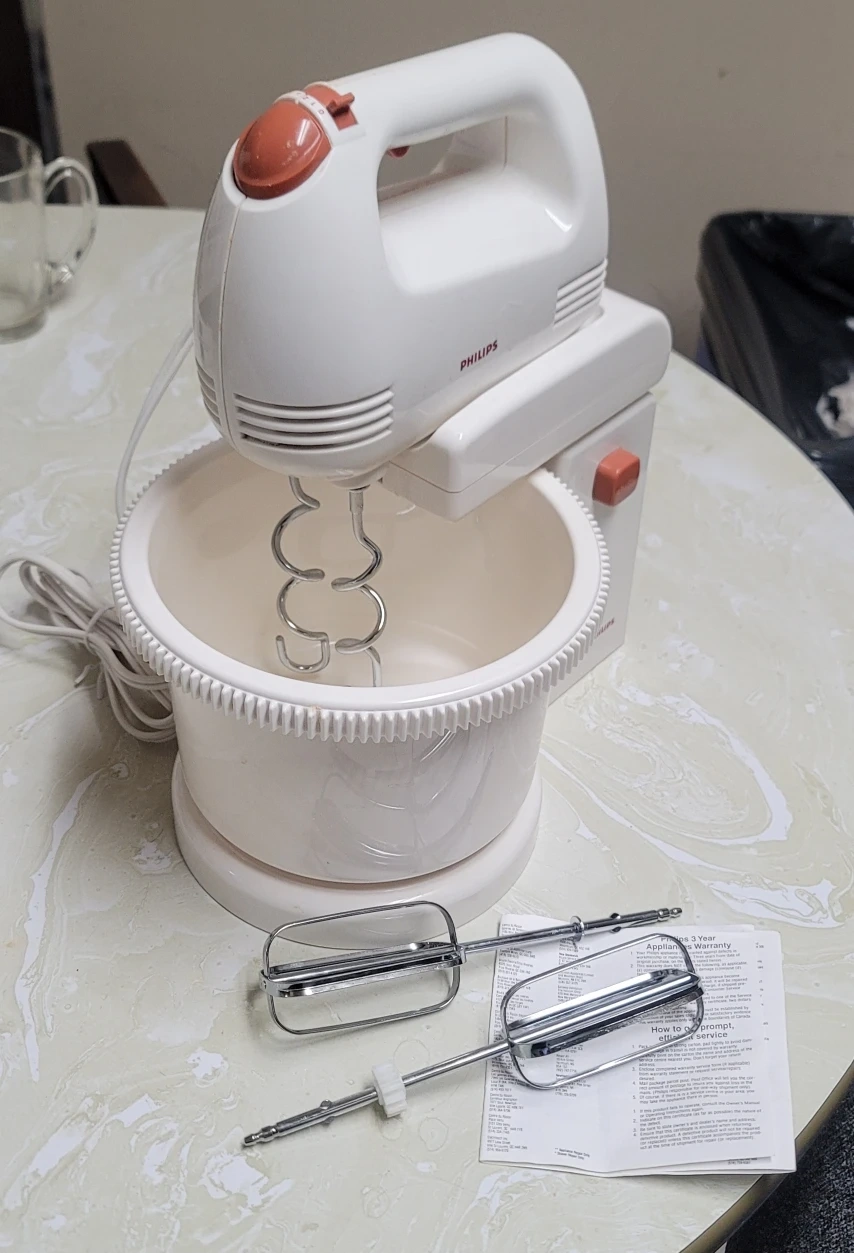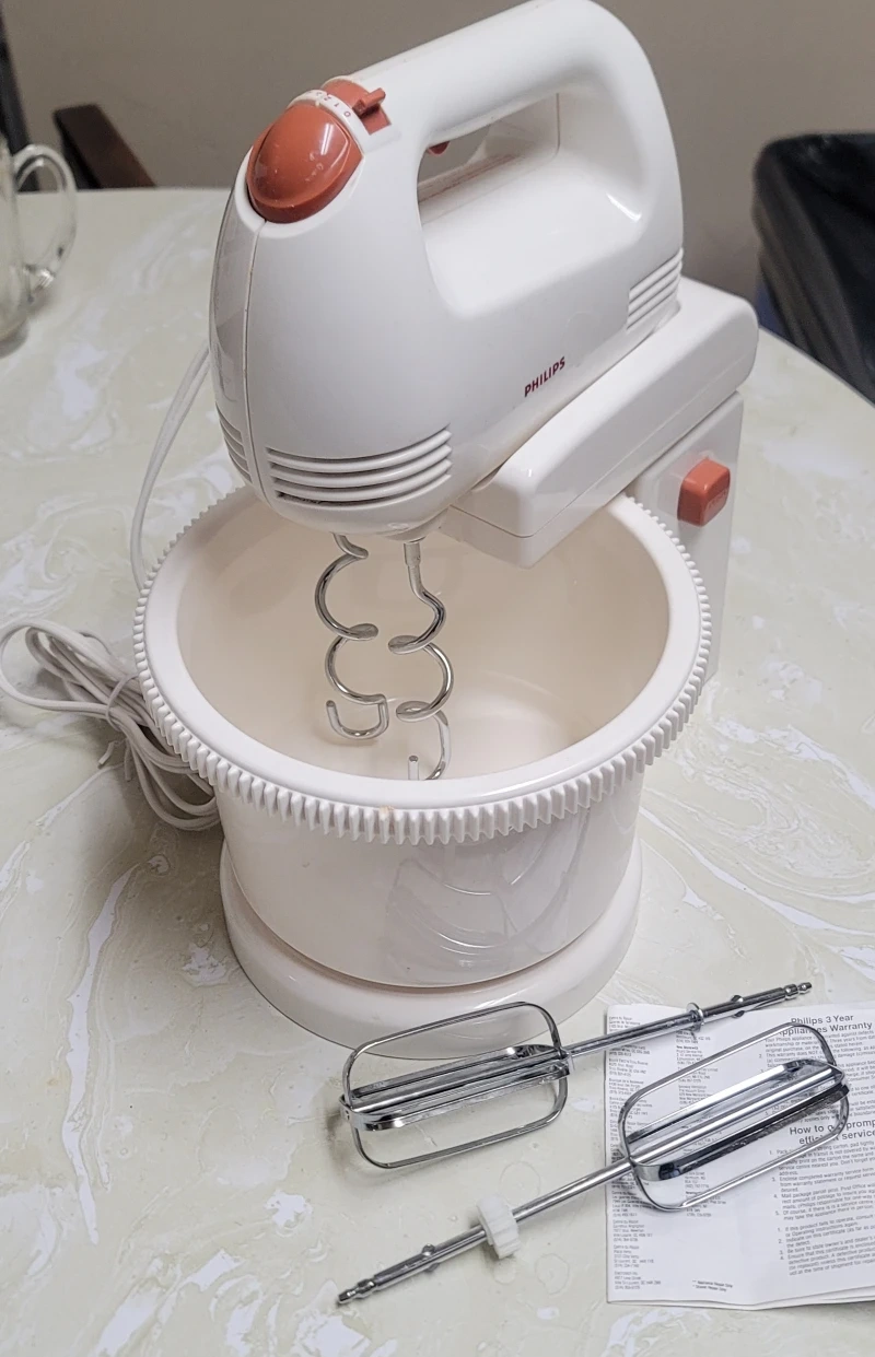 111Selling a Philips hand mixer that comes with a bowl and multiple attachments! It's perfect for baking and mixing up your favourite recipes. The mixer is in great condition and ready for a new home. It includes the bowl, beaters, and dough hooks.