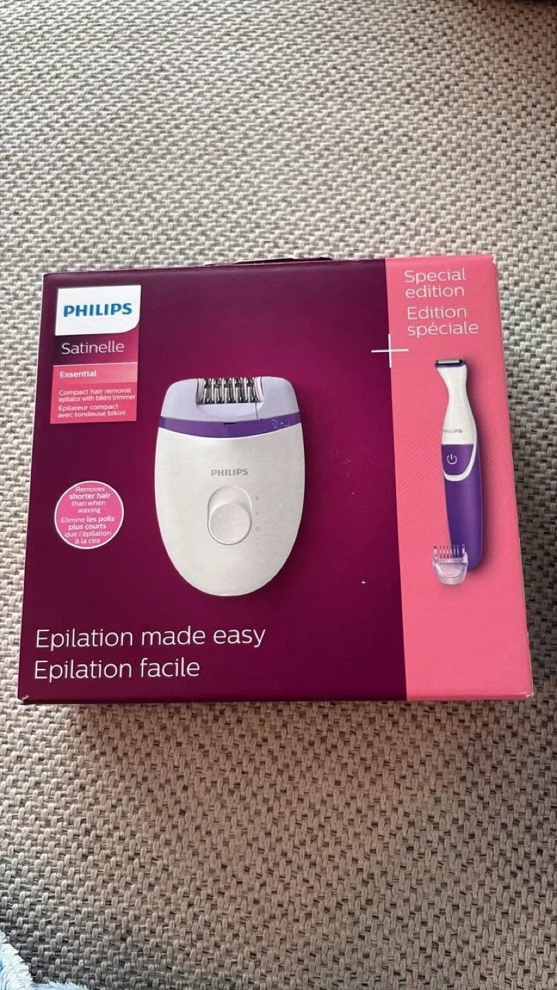 Selling a Philips Satinelle Essential epilator with bikini trimmer. It's a compact hair removal system that removes shorter hair than waxing. Epilation made easy!