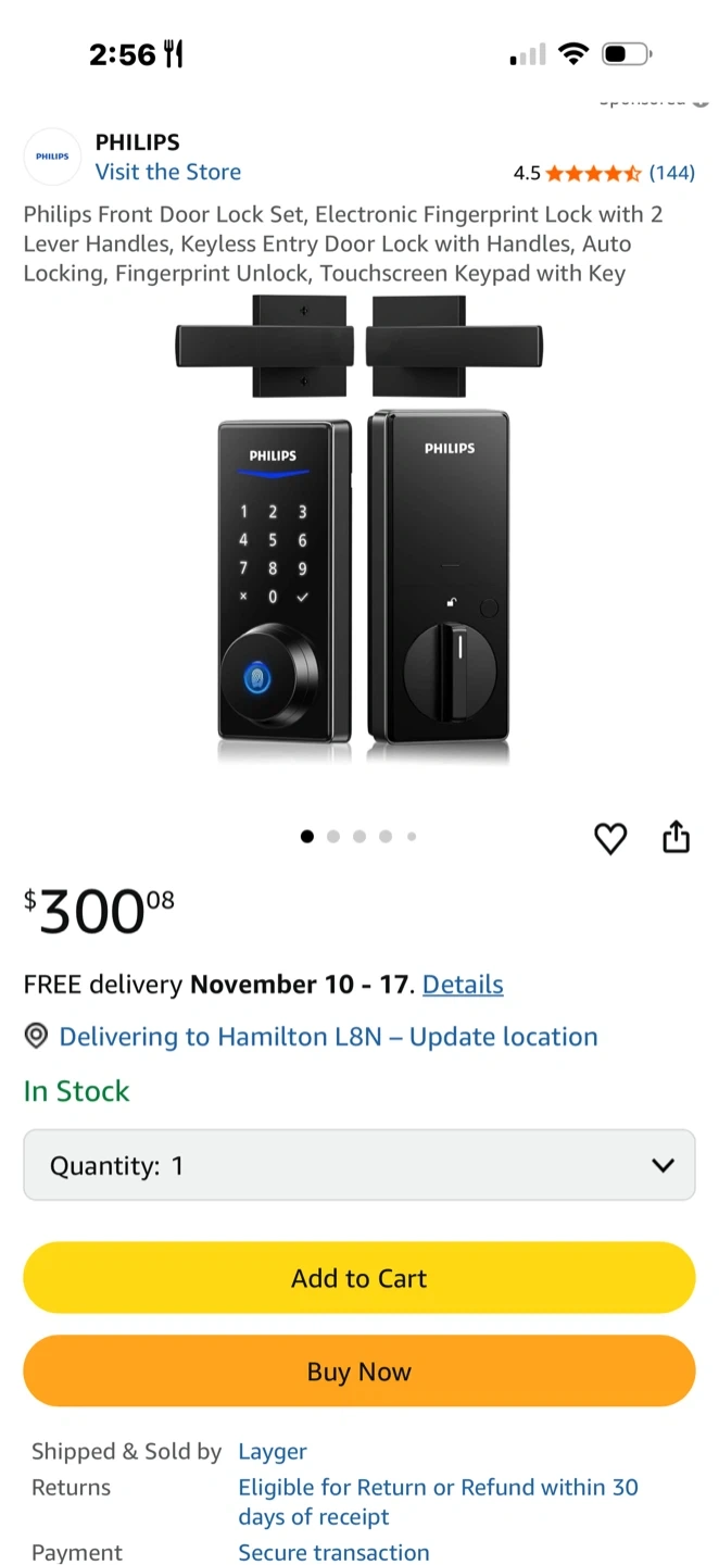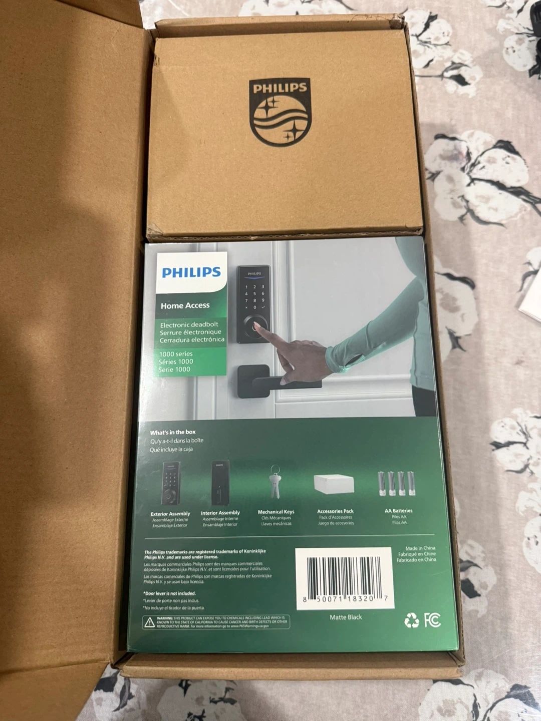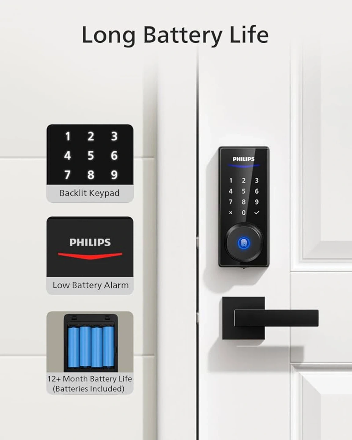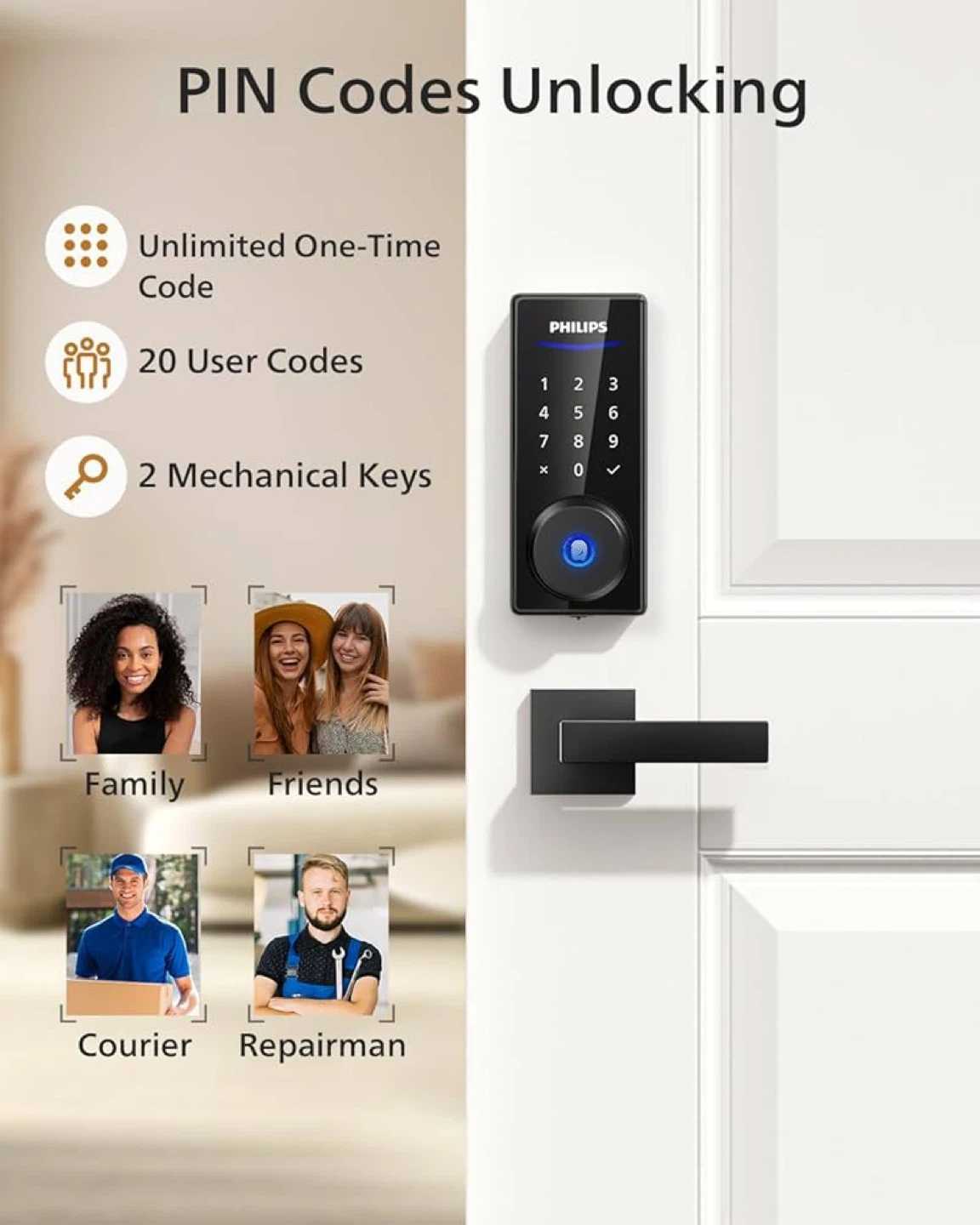 38Selling a Philips smart deadbolt lock. It features PIN code unlocking, support for 20 user codes, and includes 2 mechanical keys. The lock also boasts fingerprint unlocking with 0.3s biometric identification and a 99.9% recognition rate. It's designed for long battery life, with a backlit keypad and low battery alarm.