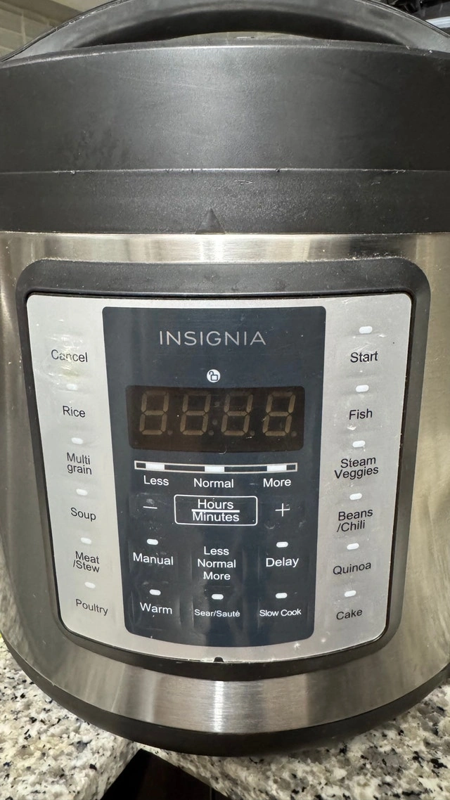 This is an Insignia pressure cooker, perfect for quick and easy meal preparation. It's used but in good working condition, ready to help you create delicious dishes with minimal effort. Additional Specifications: Multiple cooking functions (rice, meat, soup, etc.) Timer and delay start options Automatic keep-warm function