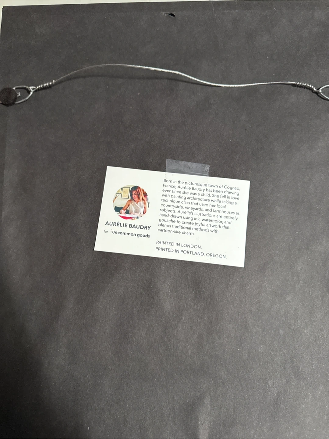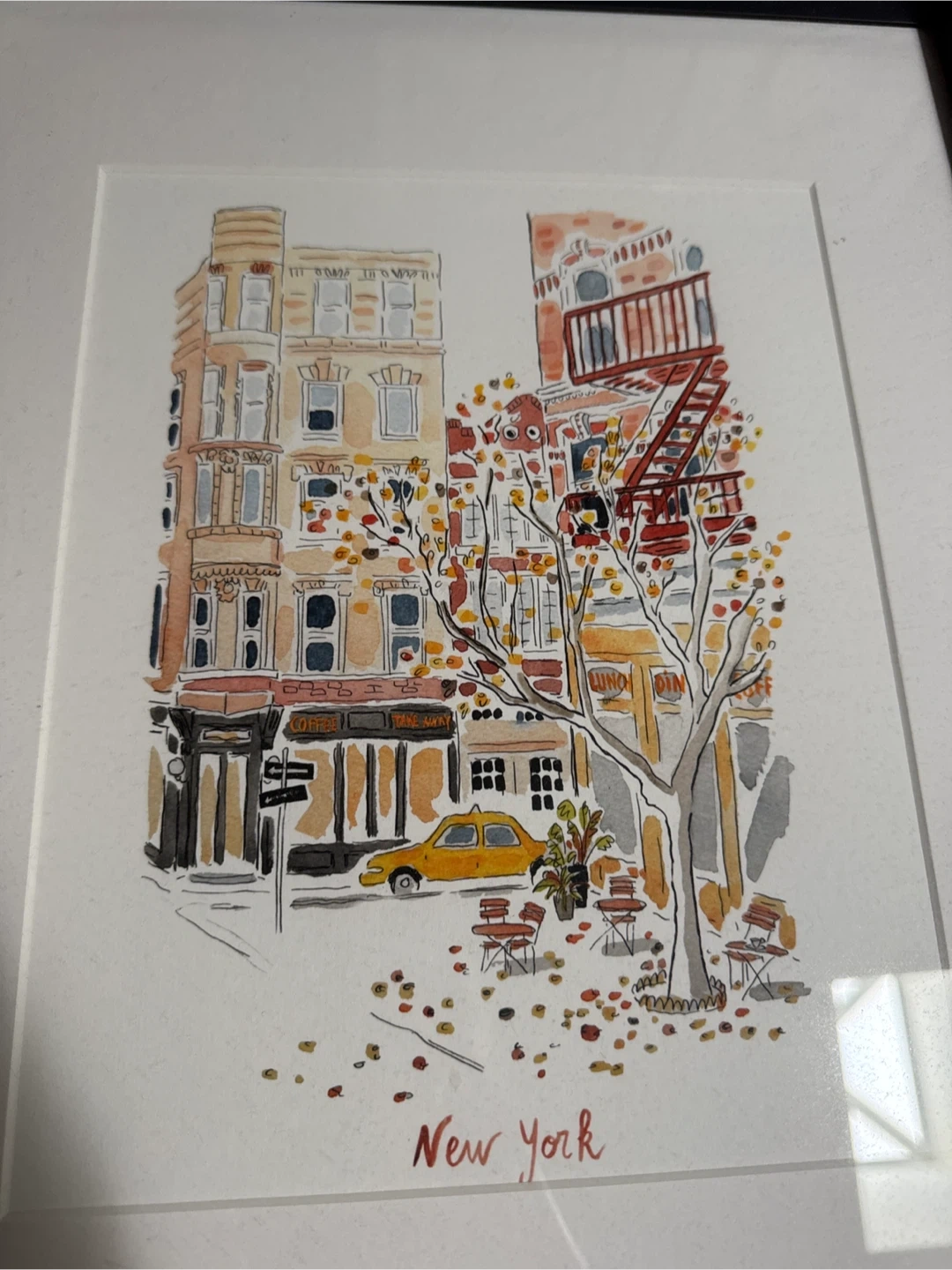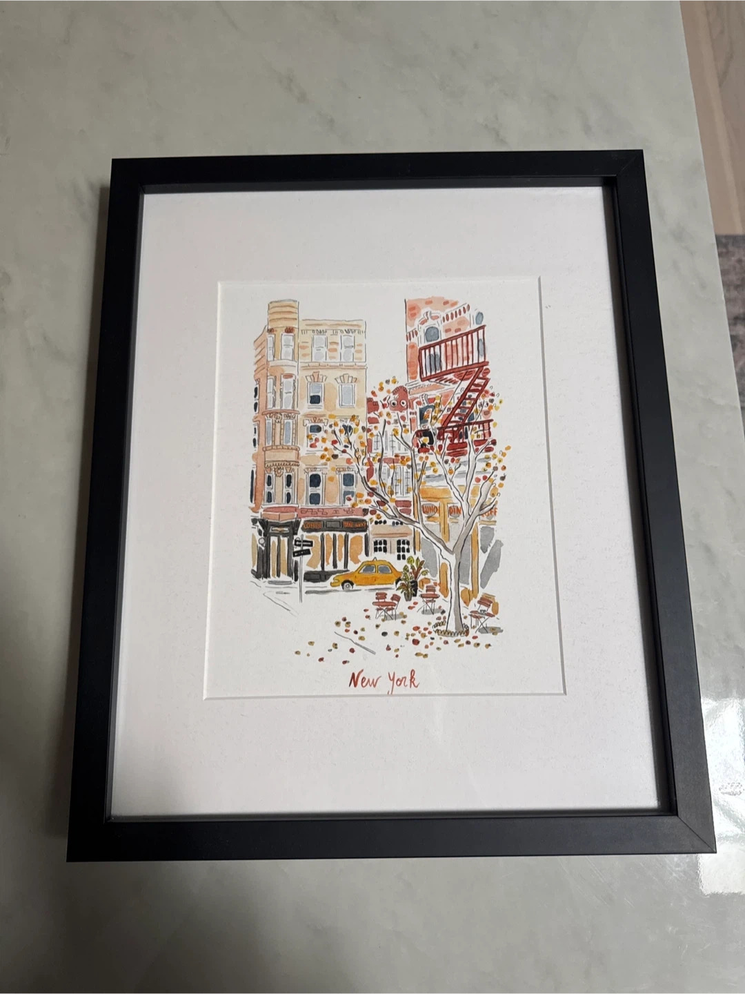 This framed watercolor print depicts a charming New York City street scene with autumn leaves. It's painted by Aurélie Baudry for Uncommon Goods. The artwork is printed in Portland, Oregon.