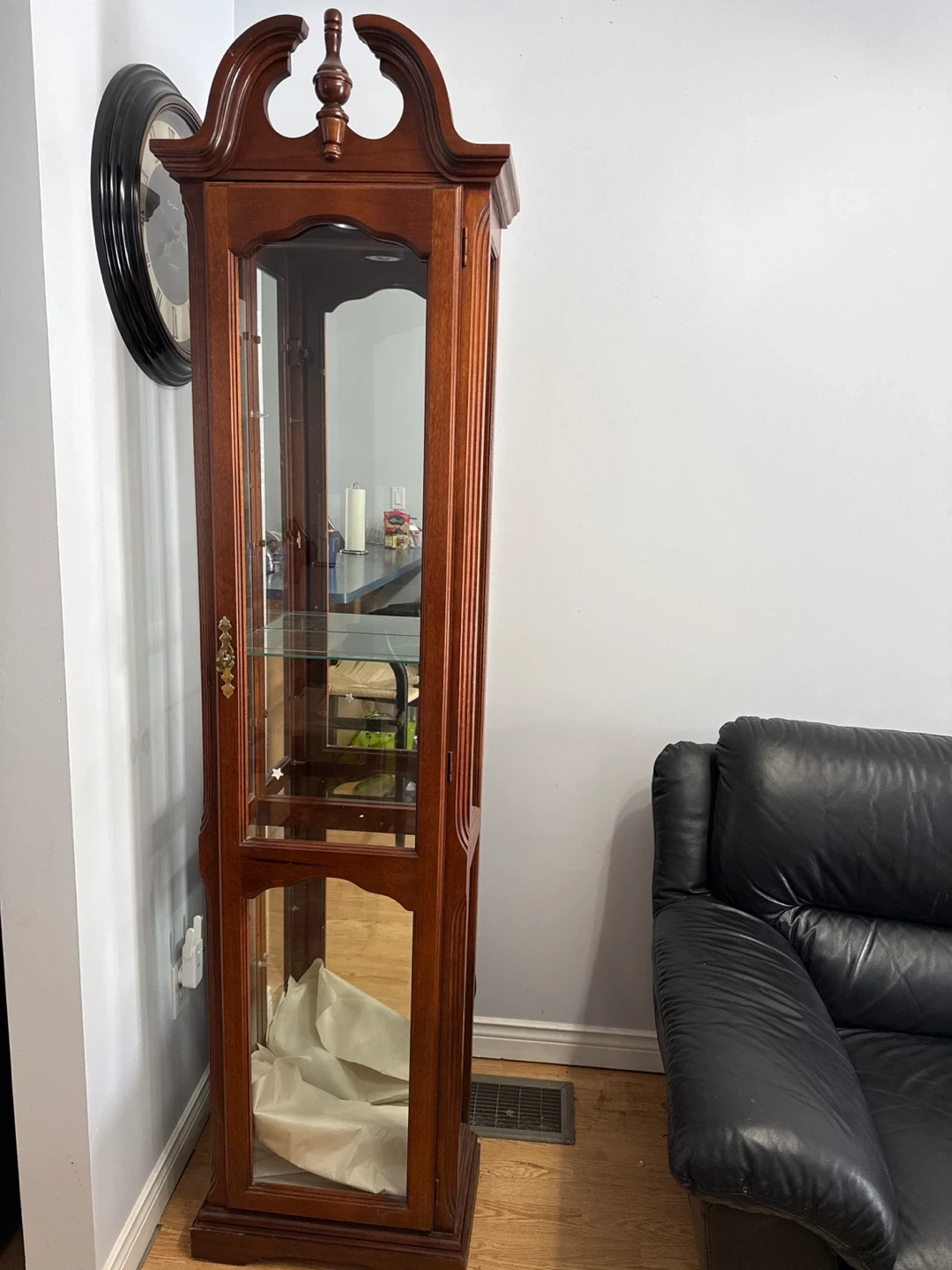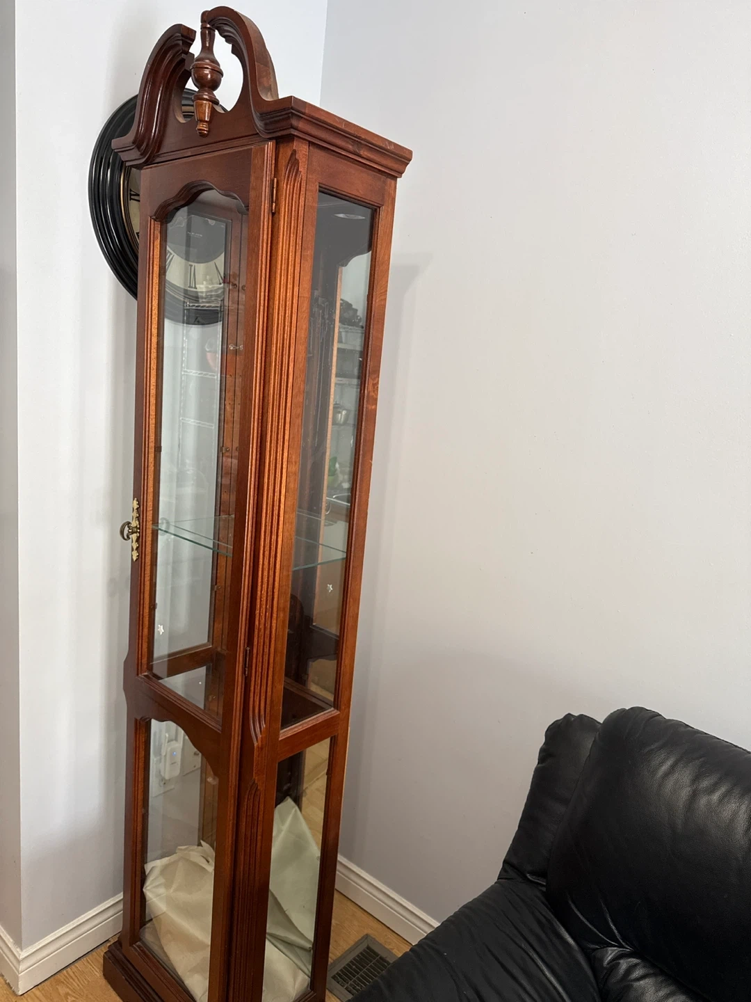 A lovely wooden curio cabinet with glass doors and shelves. It's perfect for displaying collectibles or decorative items. The cabinet has a rich wood finish and ornamental details.